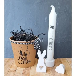 Das gefüllte Becher-Set besteht aus einem kleinen Kerzenständer mit Stabkerze „OSTERFEUER TO GO“. Dazu kommt ein niedlicher Osterhase und ein Deko-Herz.