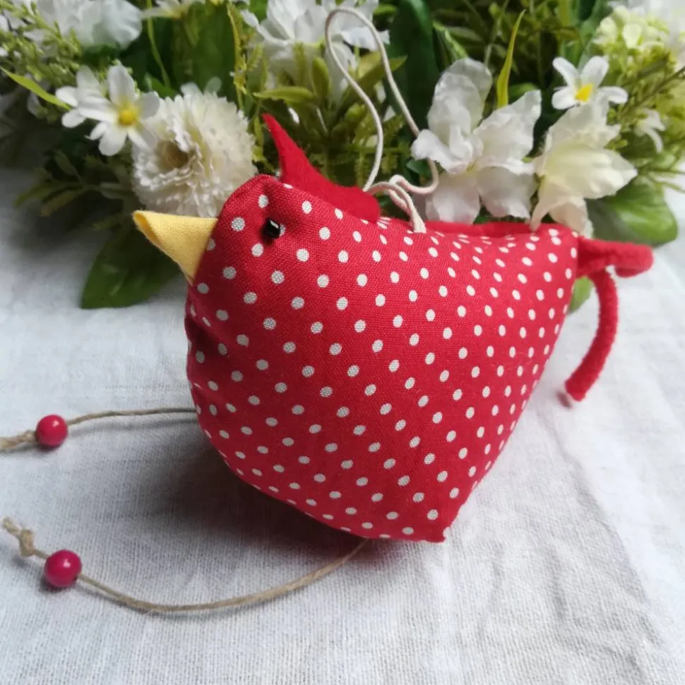 Material: Baumwolle, Polyesterfüllwatte, Filz, Satinband, Kordel, Holzperlen.