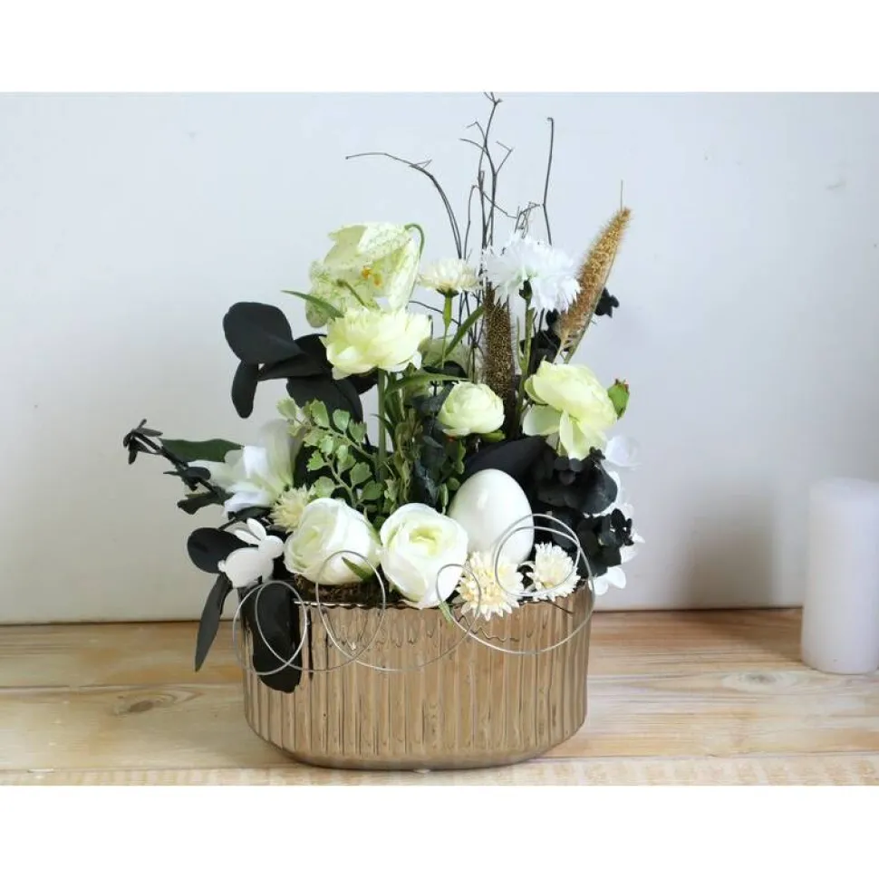 In die schicke Keramikschale wurden künstliche Blüten und Grün eingearbeitet.