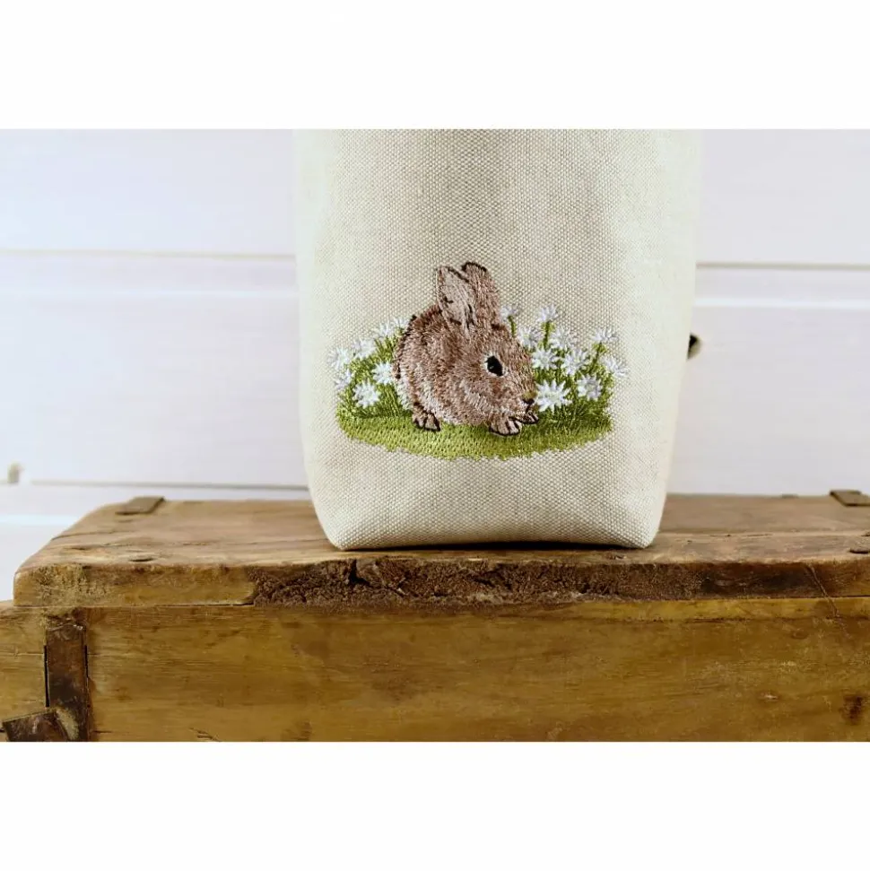 beigefarbenes Utensilo mit einer aufwändigen detailreichen Hasen- / Wiesenstickerei,
