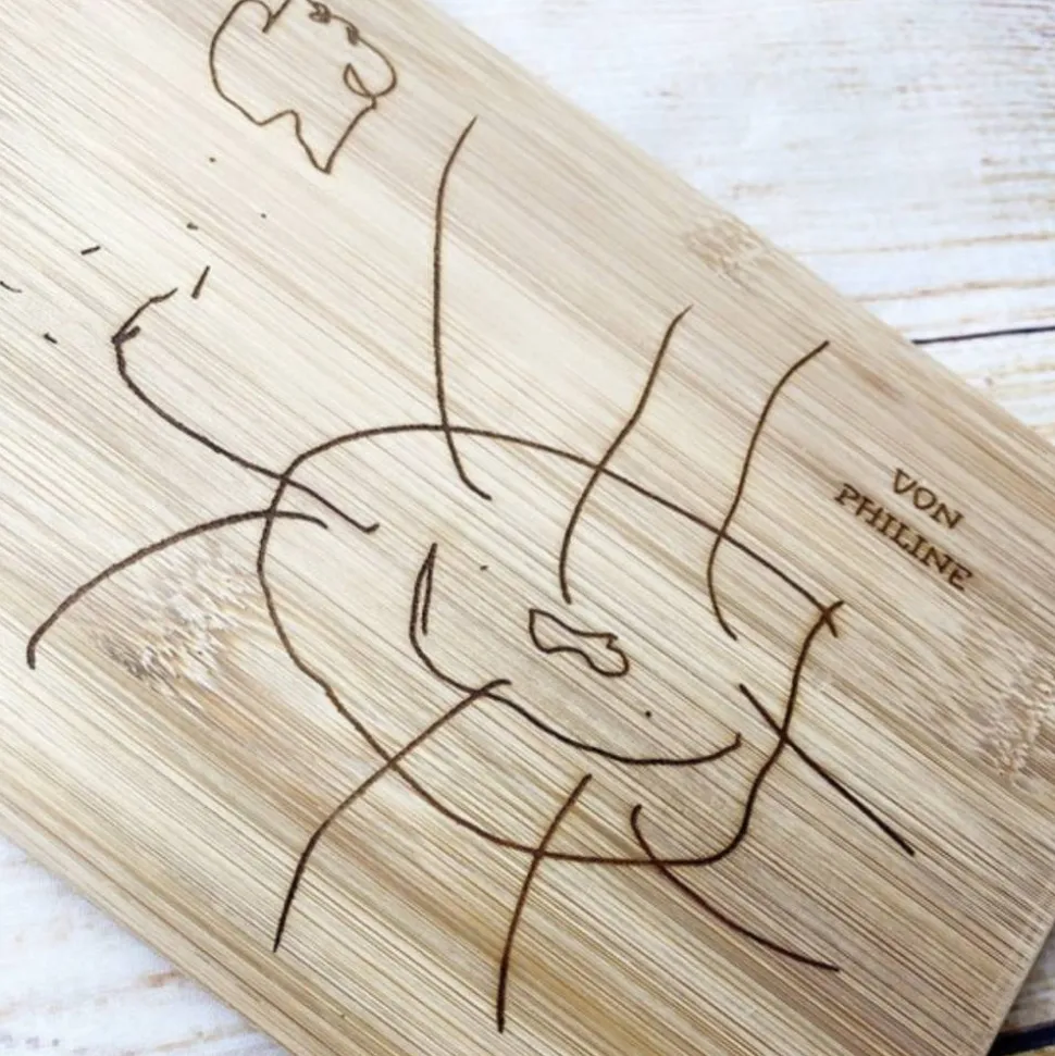 Nach Bestellung schickst du mir ein gezeichnetes Bild von deinem Kind, welches ich dann auf das Frühstücksbrett graviere.