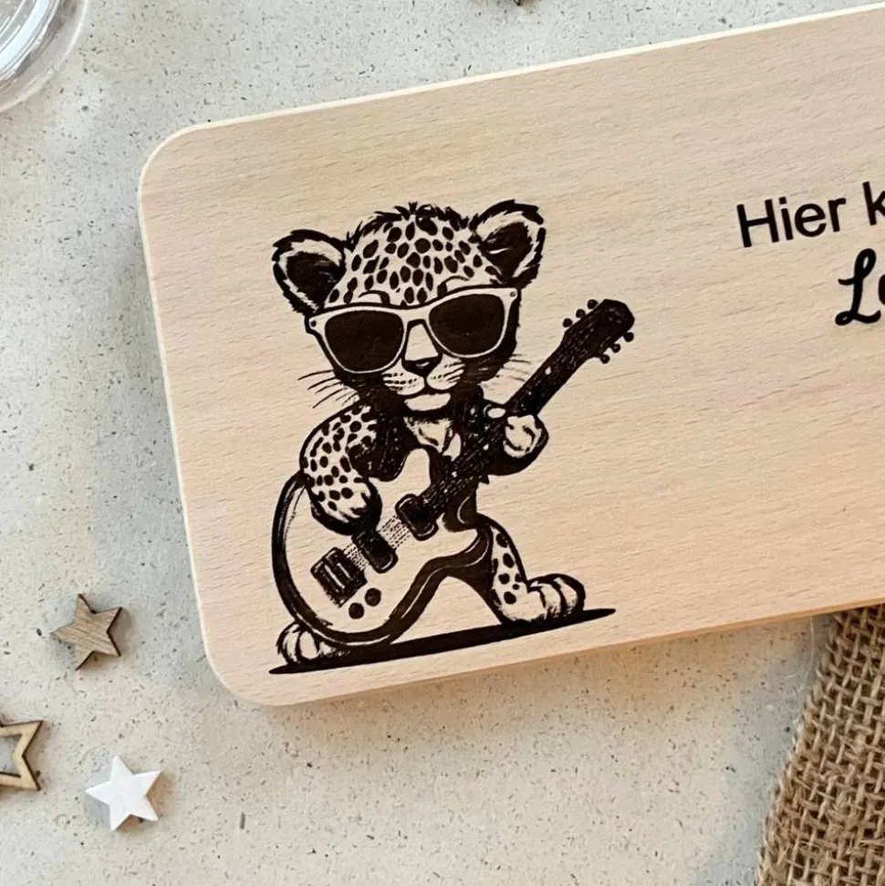 Frühstücksbrettchen personalisiert – Leopard mit Gitarre – personalisierte Geschenke Baby – Taufe Geschenk Baby