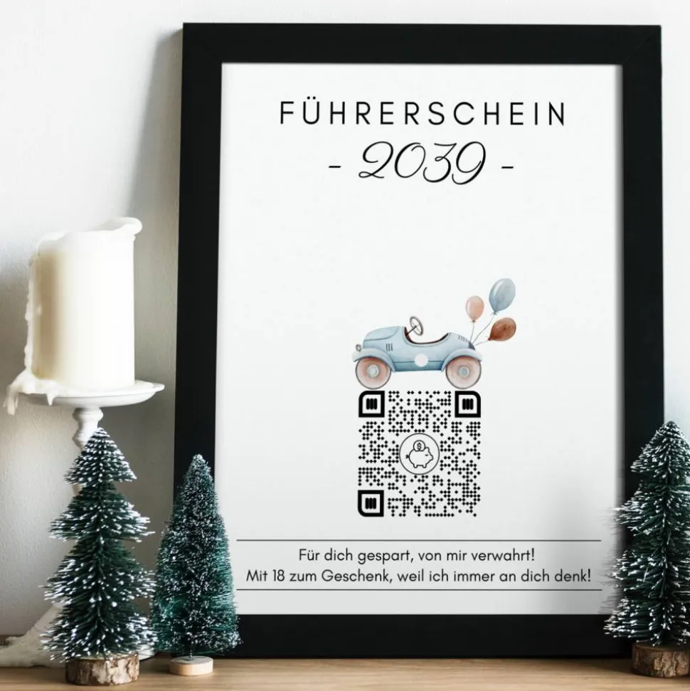Führerschein Zuschuss | Geldgeschenk | Personalisiertes Virtuelles Sparbuch | QrCode Bild | Auto Blau
