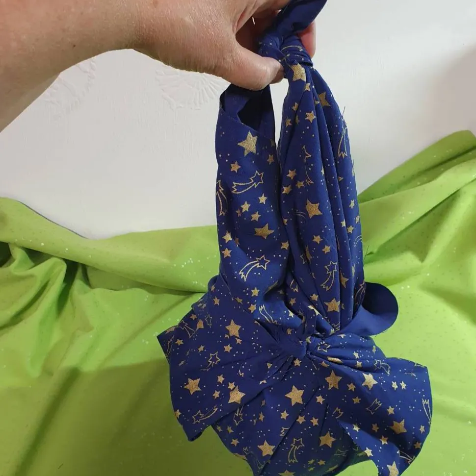 In den Fotos finden sich einige Verpackungsbeispiele. Verpackt wurde ein Hokkaidokürbis, 2 x 0,75 Wein, 1 Liter Wein und Pakete. Die Grenze für die Basisverpackung war ein Paket mit den Maßen 35 cm x 25 cm x 5 cm. Es gibt noch viel mehr Möglichkeiten, die sich fast alle mit dem Tuch verwirklichen lassen.