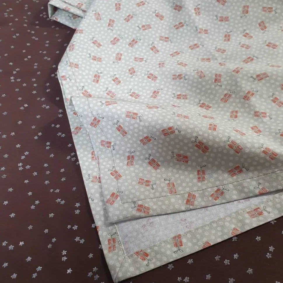 Bei dem Stoff aus 100% Baumwolle handelt sich um einen amerikanischen Designerstoff (Annie Downs „All for christmas – presents“). Er wurde gewaschen (40 Grad) und gebügelt (Stufe 2). Ich empfehle Feinwäsche ohne Schleudern.