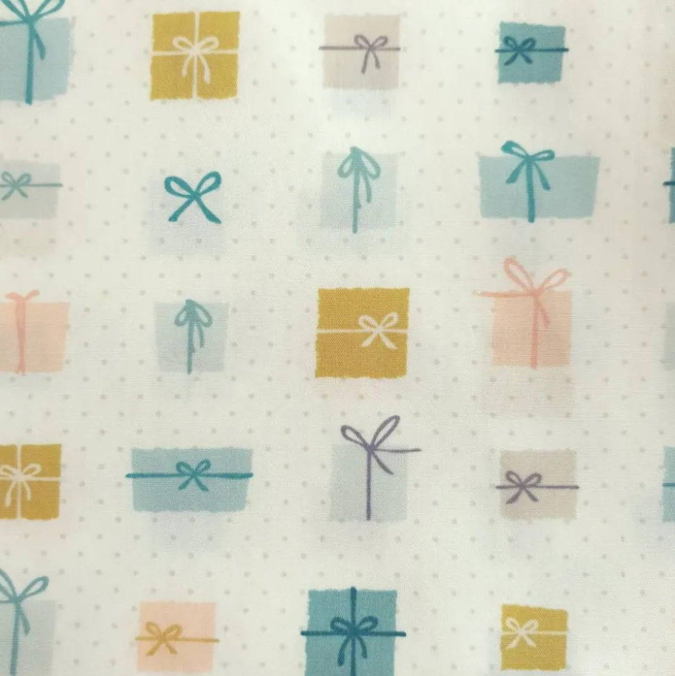 Die Farben sehen auf dem Hauptfoto am realistischsten aus. Der Stoff ist hellgrundig in einem gebrochenen Weiß. Die Pakete sind ockerfarben, hellgrau,