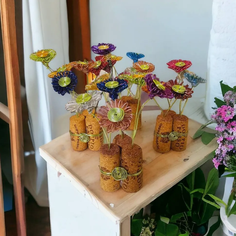 Schaffe einen hübschen Farbtupfer in deinem Zuhause mit der süßen Gänseblümchenwiese „Daisy Love“. Alle Blumen werden aus Draht, individuell von Hand geformt, auf einem sorgfältig ausgewählten Weinkorken platziert und zu einem Trio zusammengestellt. Um dem Ensemble Stabilität zu verleihen, werden die Korken verklebt und zusätzlich mit einem Draht umwickelt.