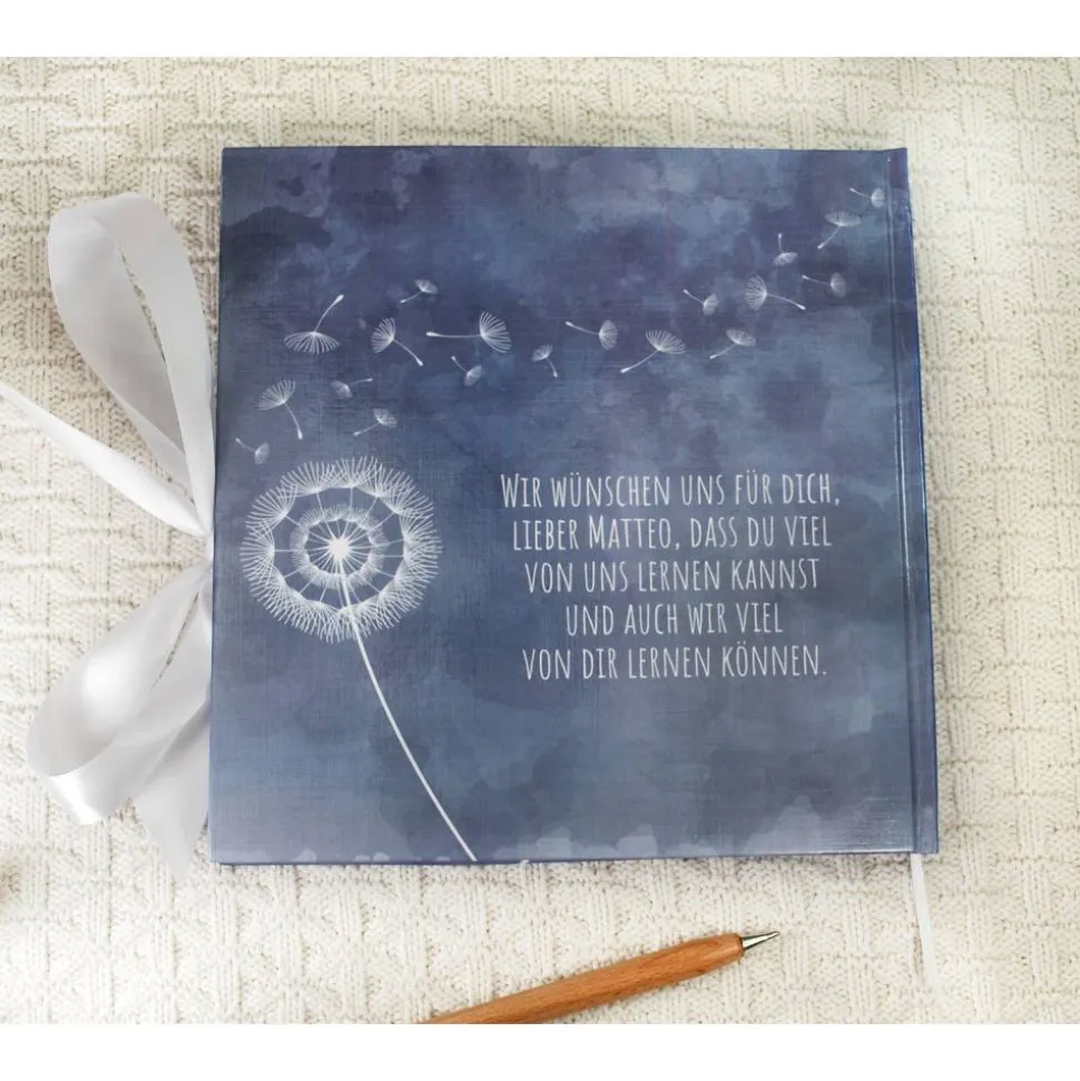 Personalisiertes Gästebuch und Erinnerungsalbum zur Taufe mit zarter Pusteblume und fliegenden Schirmchen in Weiß mit wolkigem Aquarell-Hintergrund in edlem Grau mit Seiten zum Ausfüllen und Selbstgestalten. Auch mit Fragebogen für die Gäste erhältlich.