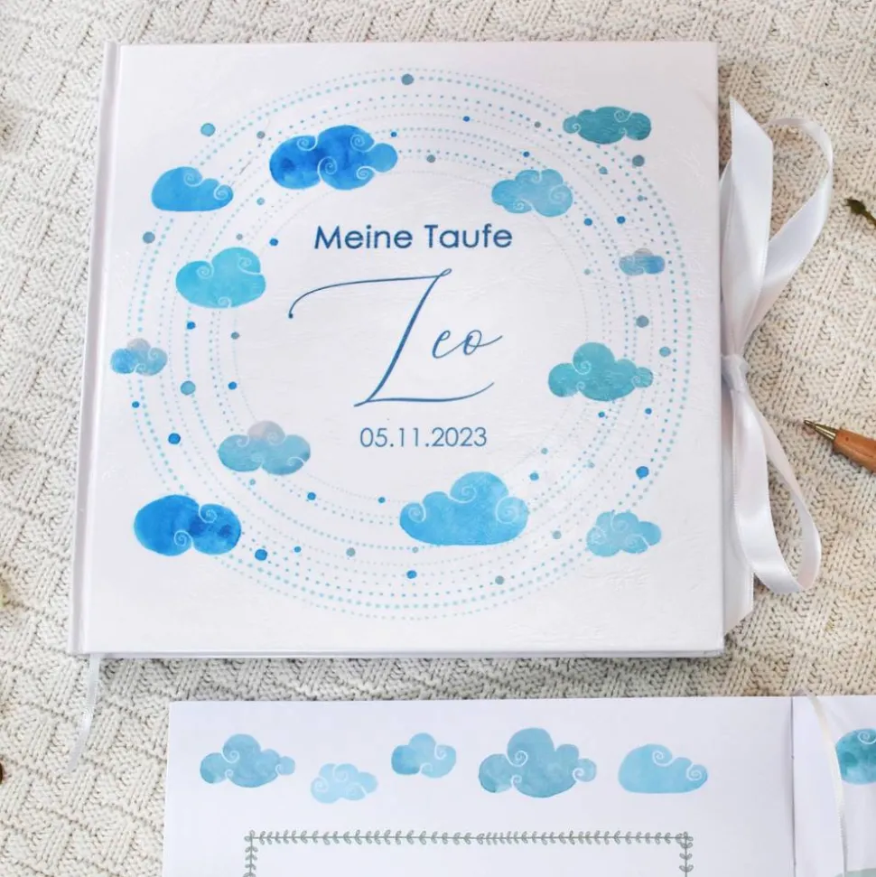 Gästebuch & Album zur Taufe mit Wolken im Aquarell in Hellblau personalsiert mit Name; blanko o. mit Fragen