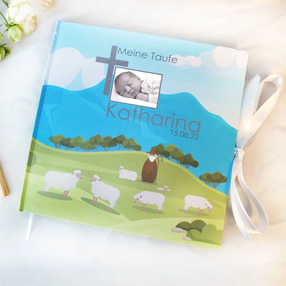 Personalisiertes Gästebuch zur Taufe mit dem christlichen Motiv der Schafe, des Hirten, der Berge und des Kreuzes; auf Wunsch mit Foto des Taufkindes; mit Seiten zum Ausfüllen und Selbstgestalten; 2 Varianten: Blanko mit leeren Seiten oder mit Fragebögen für die Taufgäste