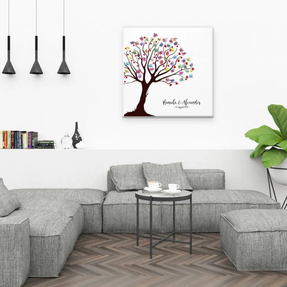 Die Gäste können mit Stempelkissen ihren Fingerabdruck auf der hochwertigen Leinwand hinterlassen und signieren. Ein einzigartiges und individuelles Hochzeitsgeschenk und Spaß auf der Hochzeitsfeier, welches noch lange in Erinnerung bleibt.
