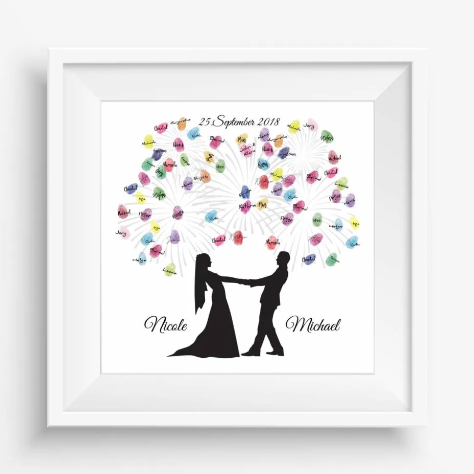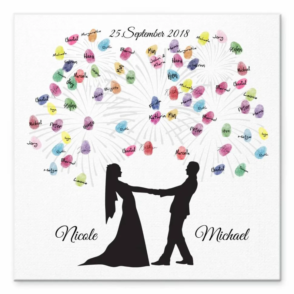 Die Gäste können mit Stempelkissen ihren Fingerabdruck auf der hochwertigen Leinwand hinterlassen und signieren. Ein einzigartiges und individuelles Hochzeitsgeschenk und Spaß auf der Hochzeitsfeier, welches noch lange in Erinnerung bleibt.