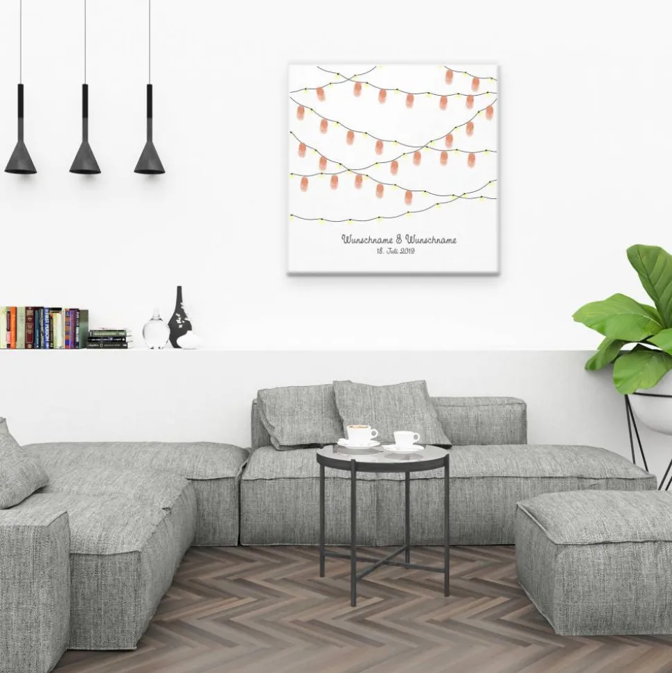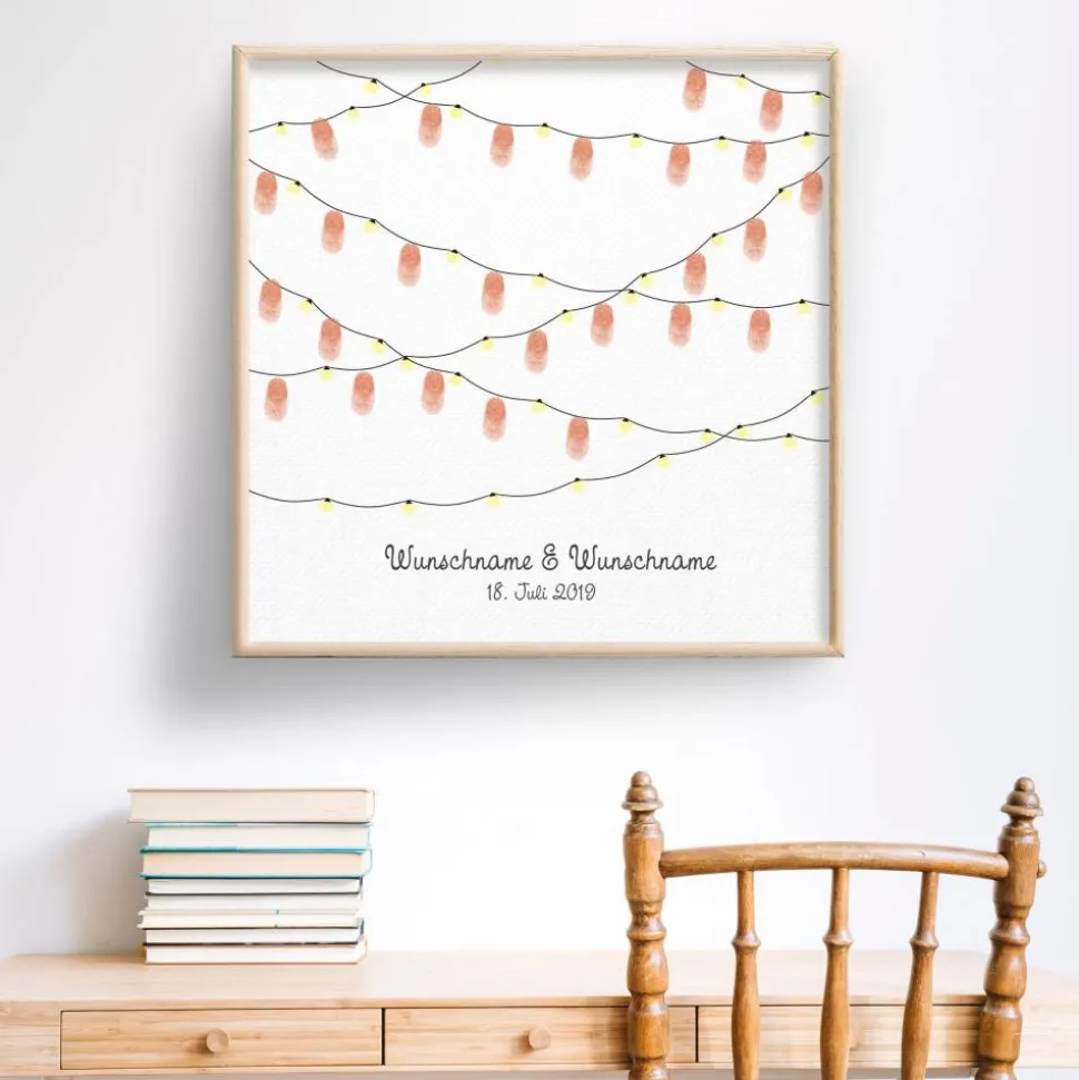 Die Gäste können mit Stempelkissen ihren Fingerabdruck auf der hochwertigen Leinwand hinterlassen und signieren. Ein einzigartiges und individuelles Hochzeitsgeschenk und Spaß auf der Hochzeitsfeier, welches noch lange in Erinnerung bleibt.