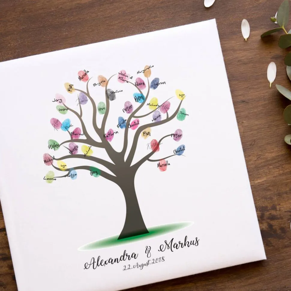Jeder Gast kann mit einem Stempelkissen seinen Fingerabdruck auf der Leinwand hinterlassen und zusätzlich signieren. So entsteht ein wundervolles, einzigartiges Kunstwerk, das Braut und Bräutigam noch lange Freude bereitet. Die satten und langlebigen Farben sorgen dafür, dass die Erinnerung an diesen besonderen Tag lebendig bleibt.