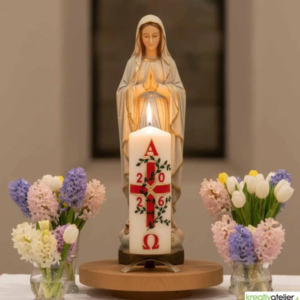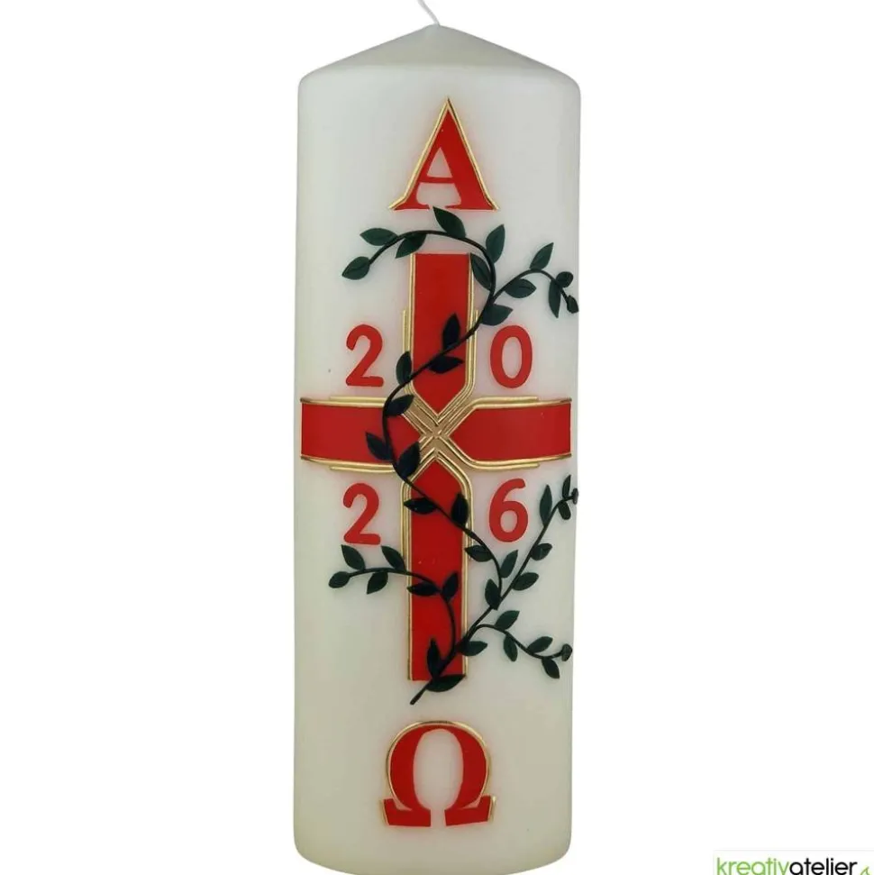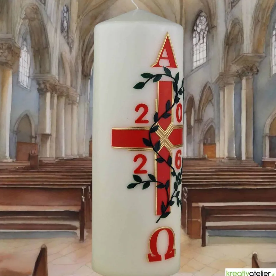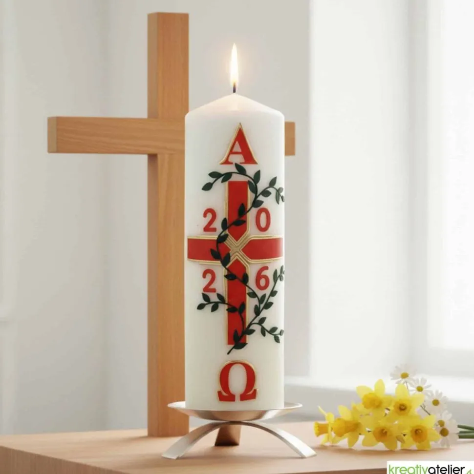 Die gold umrandete rote Kreuzverzierung auf der Kerze symbolisiert die Auferstehung Jesu Christi, die das zentrale Ereignis der christlichen Osterfeier ist. Die grüne Blumenranke, die das Kreuz umgibt, steht für Wachstum und Erneuerung und symbolisiert das Leben, das durch Christus möglich wird. Das Alpha und Omega auf der Kerze steht für den Anfang und das Ende und symbolisiert, dass Christus der Anfang und das Ende aller Dinge ist. Die aktuelle Jahreszahl auf der Kerze weist auf die Bedeutung von Ostern in diesem Jahr hin und macht die Kerze zu einem besonderen Erinnerungsstück.