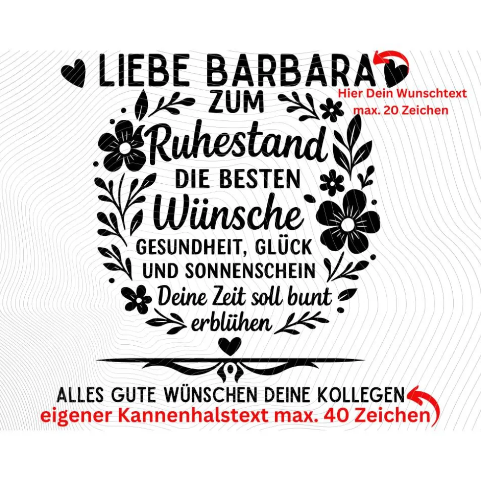 ❤ Liebe Barbara❤ Hier eigener Text zwischen den Herzen möglich (max. 20 Zeichen)Alle Gute wünschen deine Kollegen : Dein eigener Kannenhalstext (max. 40 Zeichen)