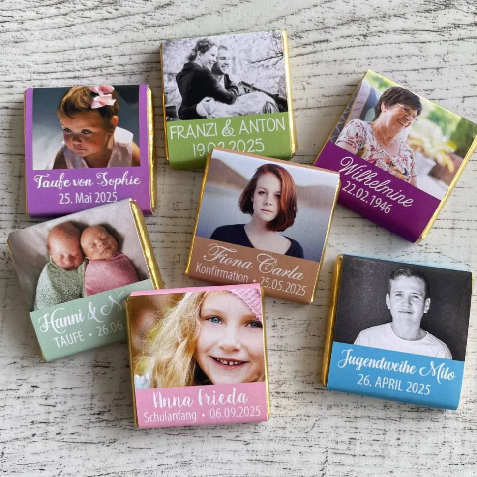 ♥ Geschmackssorte: Vollmilch, Zartbitter und weiße Schokolade (Keine Sortenauswahl – die Täfelchen werden gemischt geliefert)