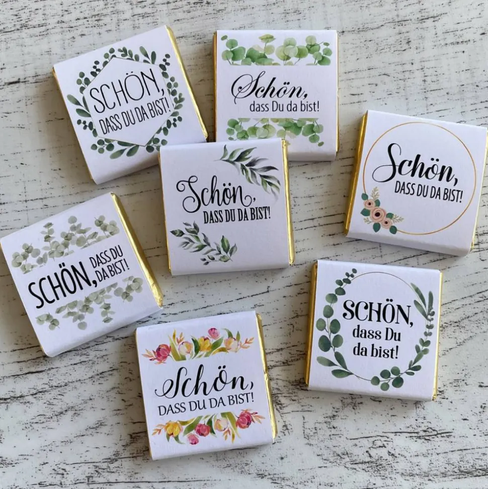 ♥ Geschmackssorten: Vollmilch, Zartbitter und Weiße Schokolade (Keine Sortenauswahl – die Täfelchen werden gemischt geliefert.)
