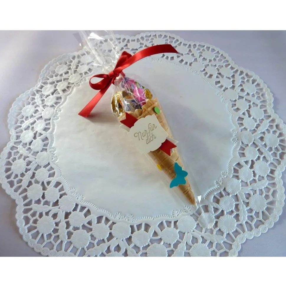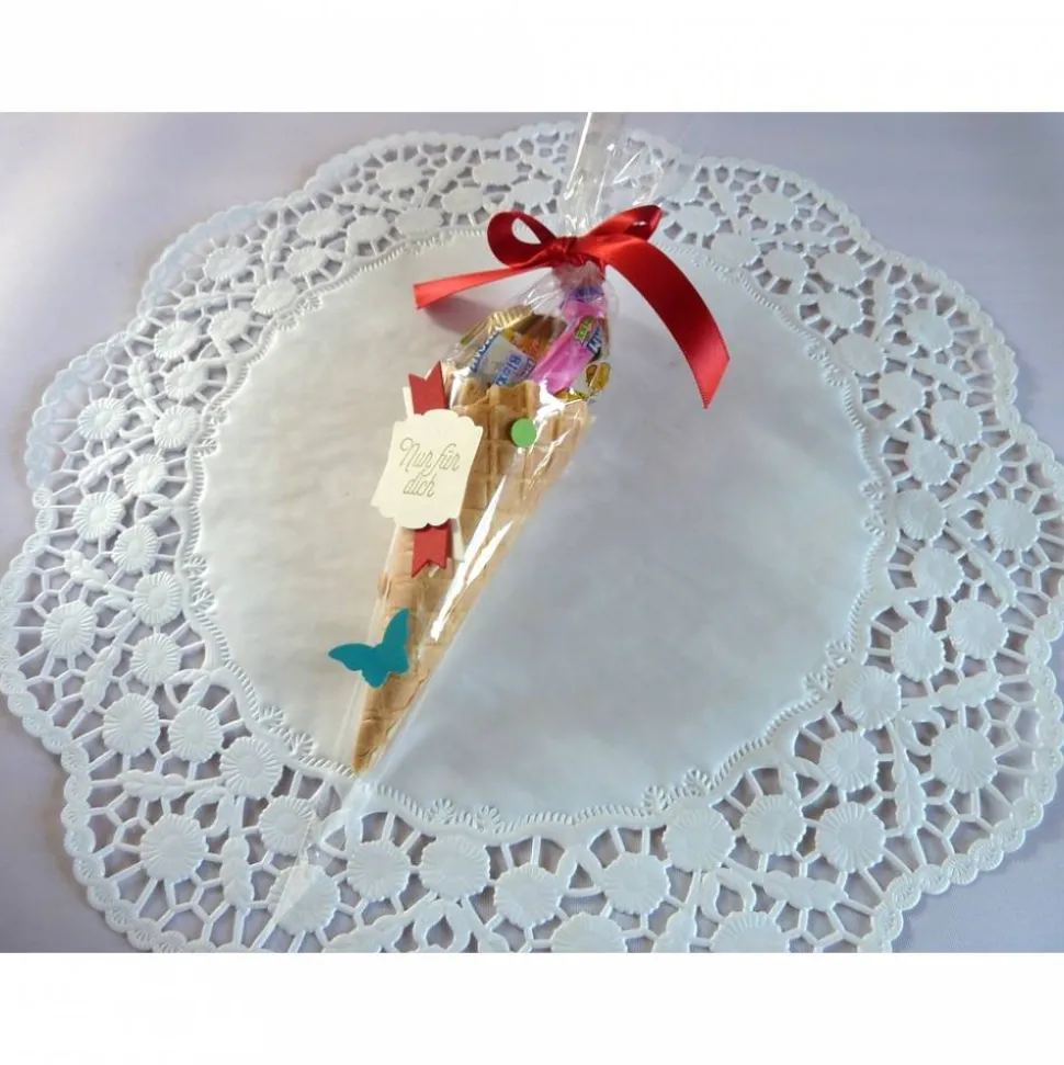 Dieses Gastgeschenk bietet sich wunderbar an den Kindern als kleines Mitgebsel nach der Einschulung, Hochzeit oder Taufe mit nach Hause zu geben. In der Eiswaffel stecken verschiedene Süßigkeiten wie auf dem Bild zu sehen ist. Die Cellophantüte hab ich außen noch aufgehübscht mit Schmetterlingen, einem bestempeltem Etikett und mit einem Satinband versehen.