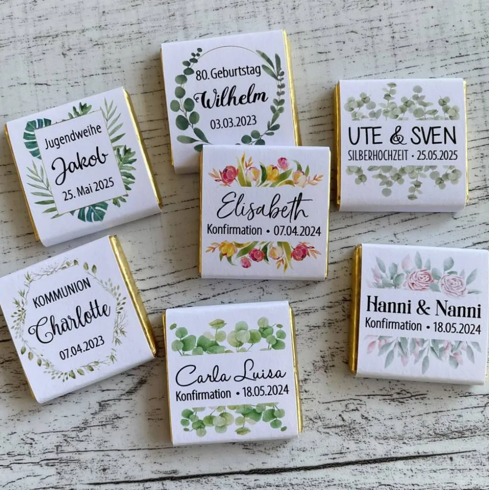 ♥ Geschmackssorten: Vollmilch, Zartbitter und Weiße Schokolade (Keine Sortenauswahl – die Täfelchen werden gemischt geliefert.)