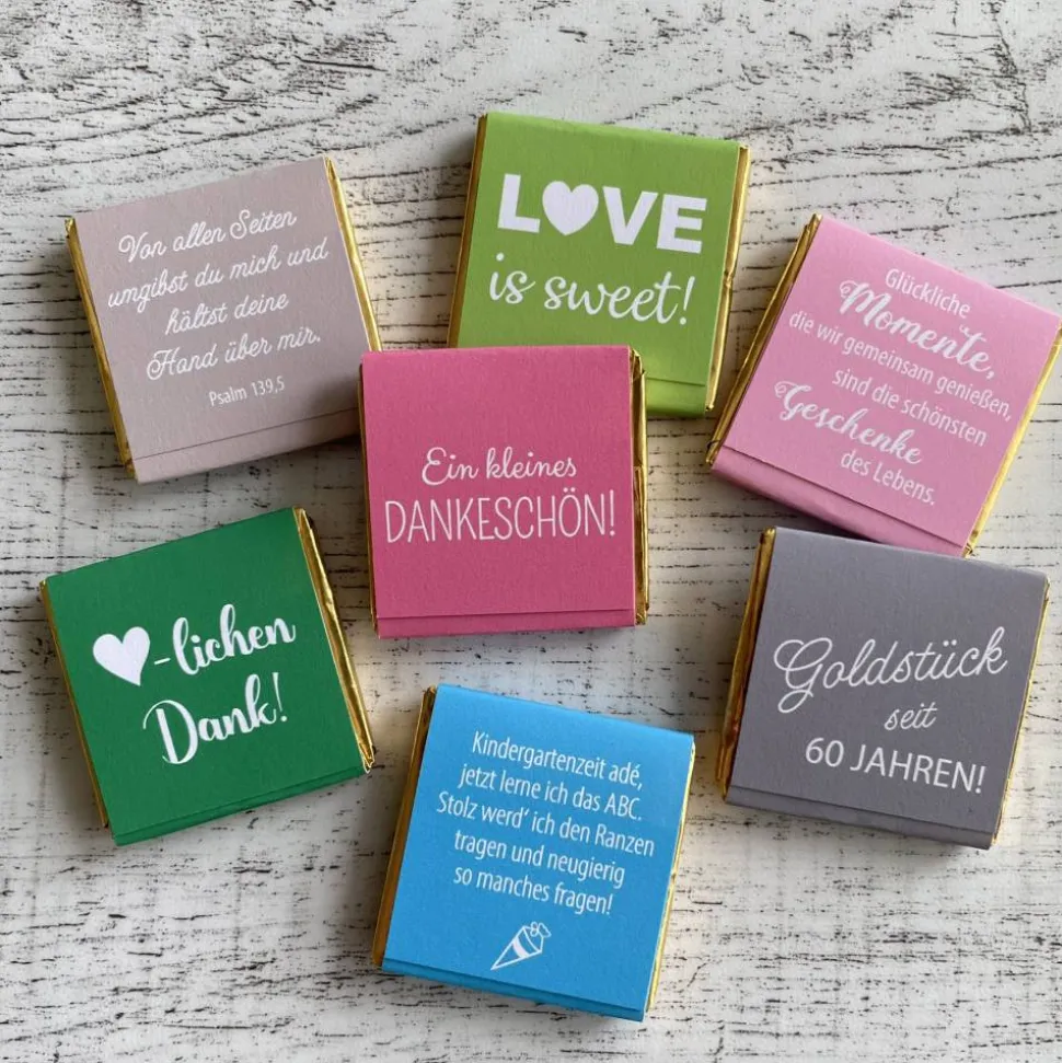 ♥ Geschmackssorten: Vollmilch, Zartbitter und Weiße Schokolade (Keine Sortenauswahl – die Täfelchen werden gemischt geliefert.)