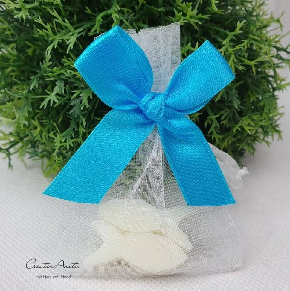 Dekoriert mit einem Satinschleifenband in TÜRKIS.