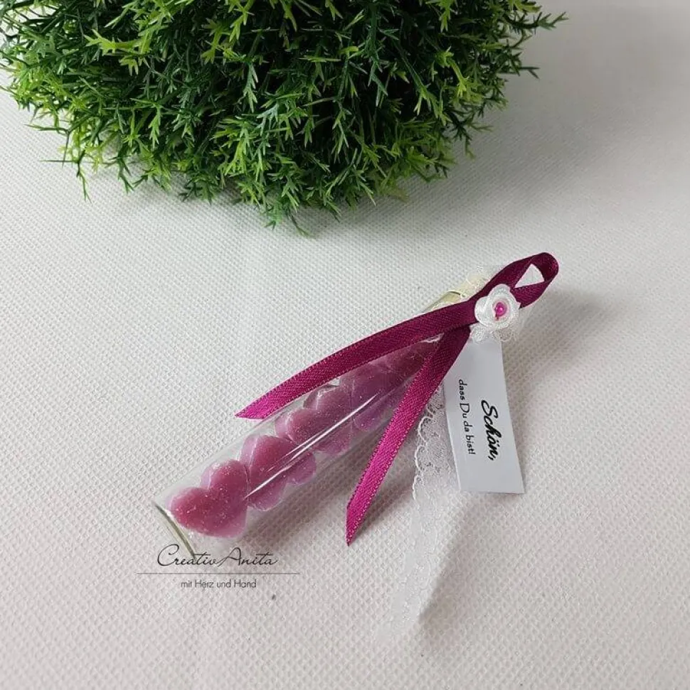 1 St. Gastgeschenk befüllt mit 5 Schafmilchseifen-Herzen im REAGENZGLAS