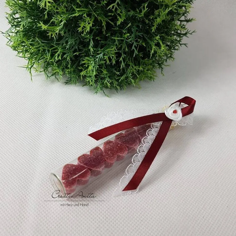1 St. Gastgeschenk befüllt mit 5 Schafmilchseifen-Herzen im REAGENZGLAS