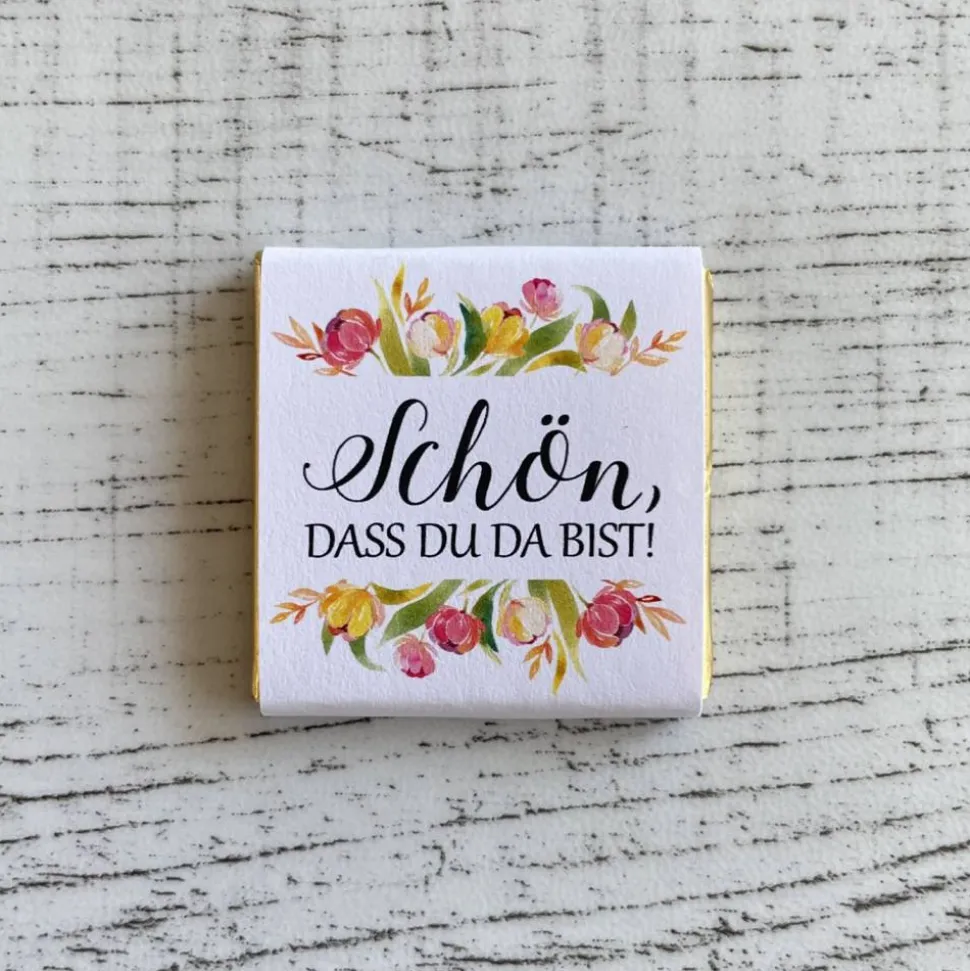 Diese quadratischen Schokotäfelchen sind eine wunderbare Überraschung für Ihre Gäste und gleichzeitig ein herziges Andenken an Ihren ganz besonderen Tag. Die süßen Gastgeschenke ziert eine Banderole mit der herzlichen Botschaft „Schön, dass Du da bist!“ in verschiedenen Designs (die Rückseite bleibt unbedruckt). Wählen Sie einfach Ihre gewünschte Motivnummer aus. Die original belgischen, feinen Schokoladentafeln werden gemischt in den Sorten Zartbitter, Vollmilch und weiße Schokolade geliefert.
