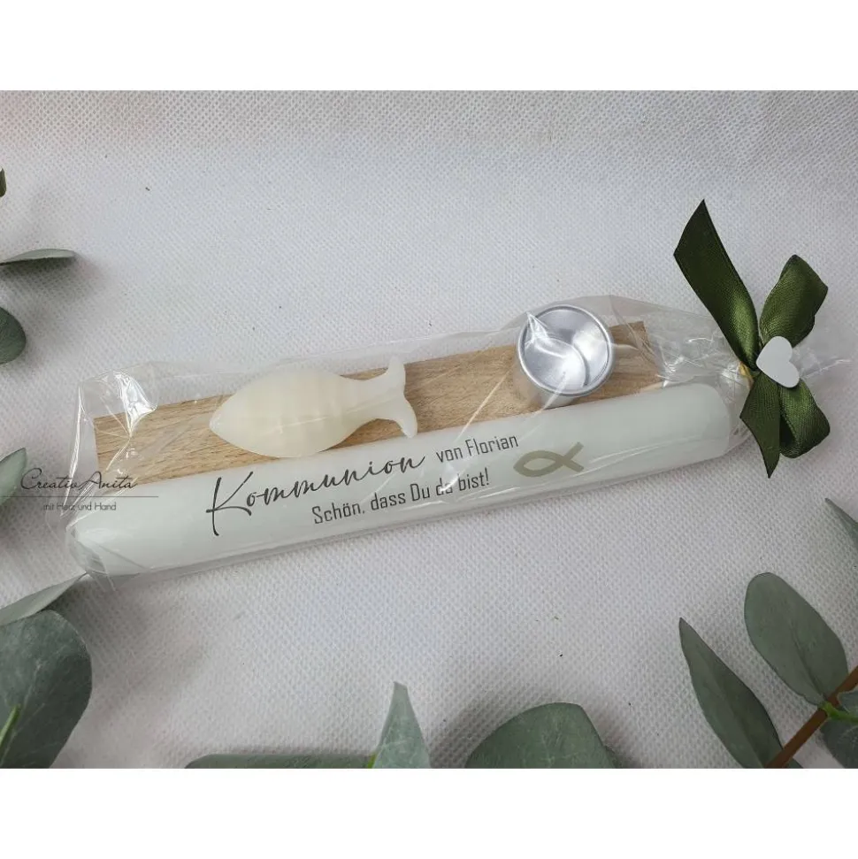 Passend dazu gibt es einen Kerzenhalter in silber, dieser ist auf einem Holz fest montiert. Die kleine Holzleiste ziert ein Seifenfisch in der Duftnote Classic (weiß).