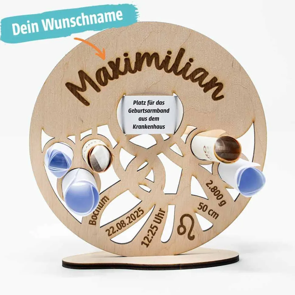 Mach den Baum einzigartig: Auf Wunsch gravieren wir alle wichtigen Details – Name, Geburtsdatum, Geburtszeit, Geburtsort, Sternzeichen, Größe und Gewicht. So wird der Baum zu einem ganz persönlichen Geschenk für das Kind und die Familie. Zusätzlich kannst du kleine Botschaften, Geldgeschenke oder Glückwünsche in die versteckten Aussparungen der Äste legen.