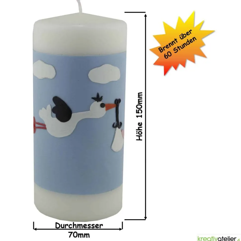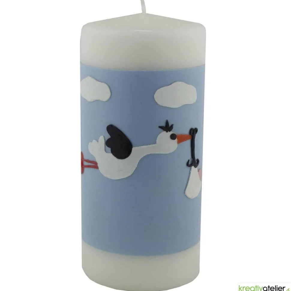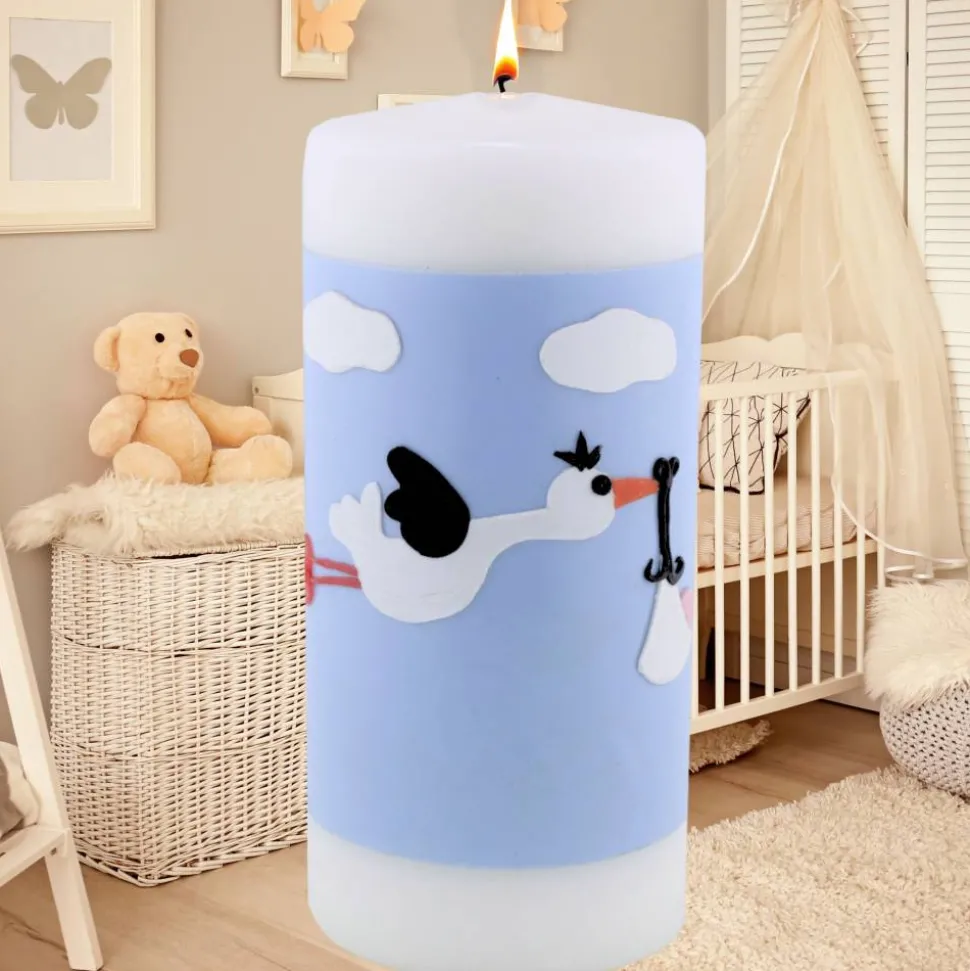 Diese liebevoll gestaltete, weiße Geburtskerze ist mit einem handgefertigten Storch verziert, der eine Baby-Trage im Schnabel hält. Der Storch und die Baby-Trage sind sorgfältig aus Wachsplatten ausgeschnitten und mit viel Liebe zum Detail aufgebracht. Die Kerze hat einen himmelblauen Hintergrund mit kleinen weißen Wolken, was dem Design eine besonders friedliche und freudige Atmosphäre verleiht. Auf dem himmelblauen Hintergrund ist ausreichend Platz für den Namen und das Geburtsdatum des Neugeborenen. Die gesamte Rückseite der Kerze bietet Raum für weitere persönliche Angaben wie Gewicht, Größe und Uhrzeit.