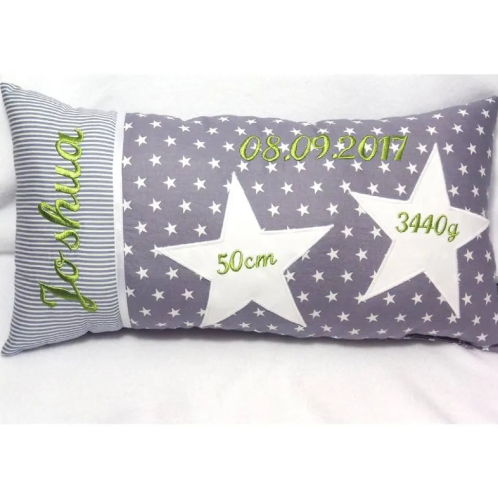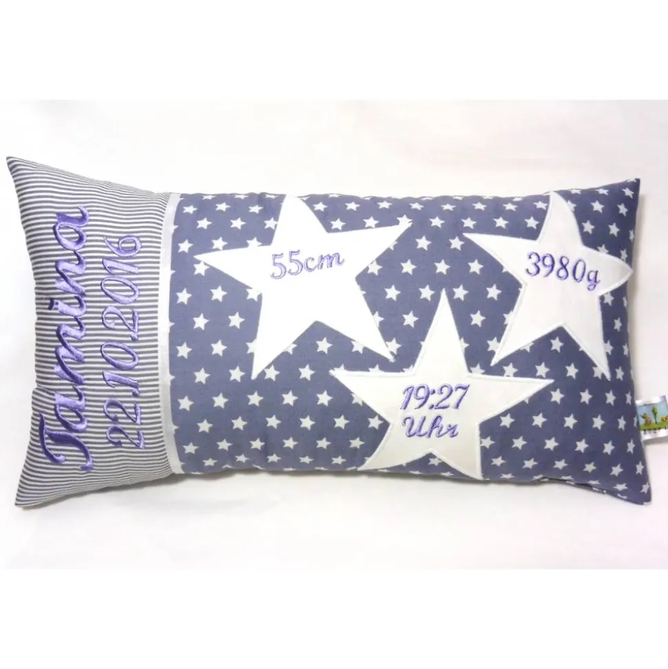 Das bestickte Geburtskissen ist mit Polyester-Faserbällchen gefüllt und kann bei 30°C Feinwäsche gereinigt werden. Bitte nicht in den Trockner geben.