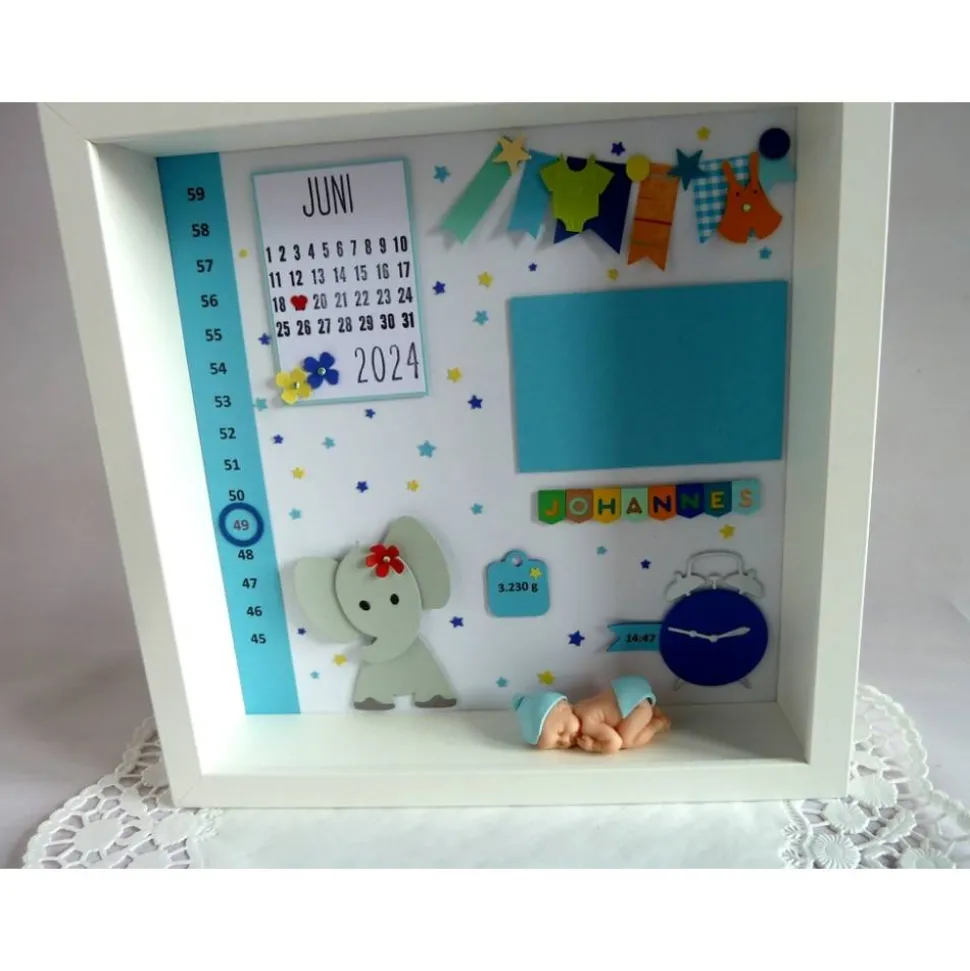 Die Eltern des Neuankömmlings freuen sich bestimmt über dieses schöne pesönliche Geburtsgeschenk, der kleine Elefant ist der absolute Hingucker.