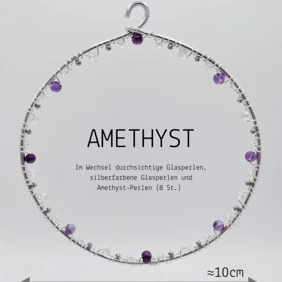 Dieser Fensterschmuck wird liebevoll als Handarbeit gefertigt. Jeder Kreis wird sorgfältig aus rostfreien Aluminiumdraht geformt und mit glänzenden Glasperlen und Energie spendenden Heilsteinen dekoriert. Jeder Fensterschmuck ist ein Unikat mit 8 Heilsteinen und einem Durchmesser von ungefähr 10 cm.