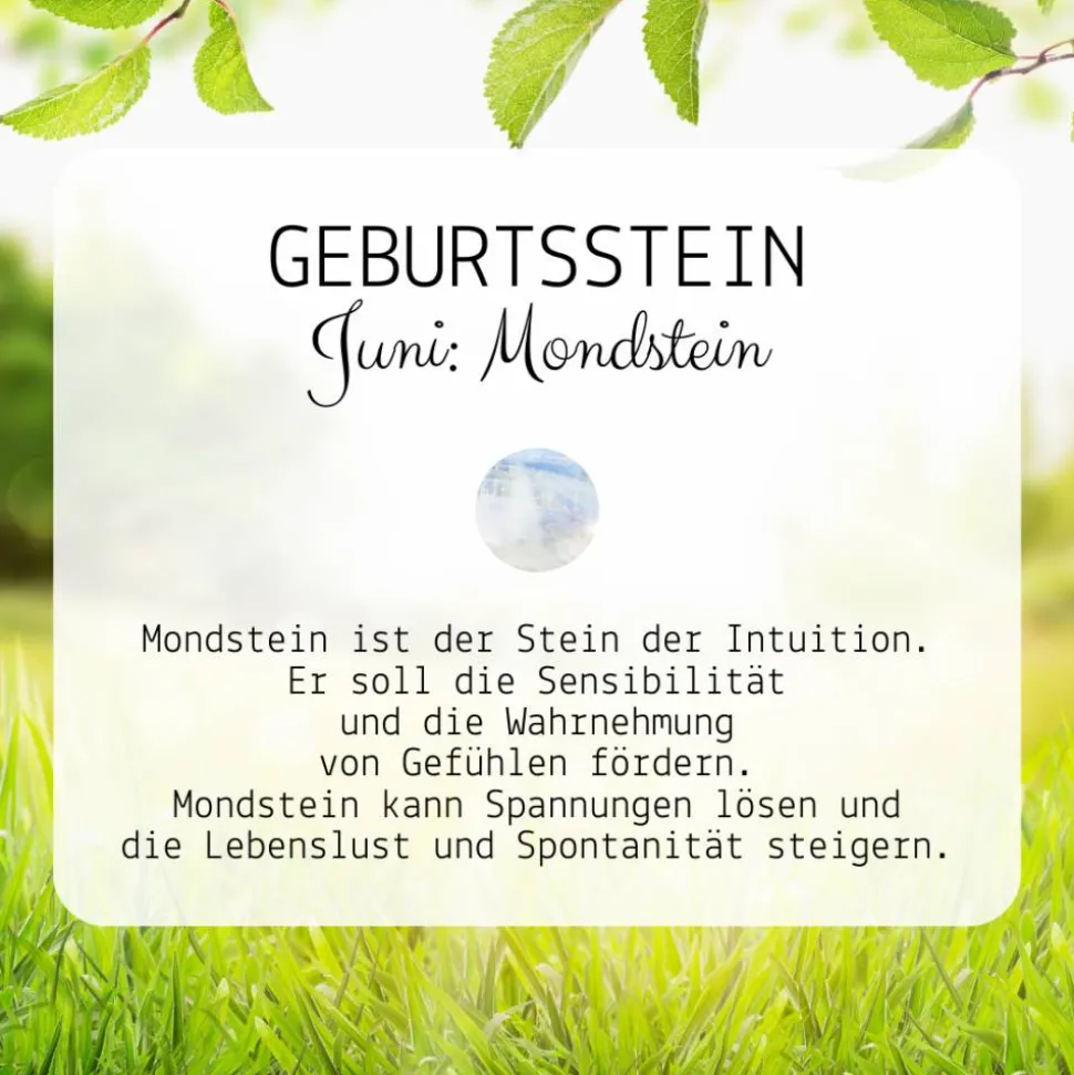Wusstest du, dass jeder Mensch einen eigenen Geburtsstein hat? Der Geburtsstein des Junis ist Mondstein – Stein der Intuition. Er soll die Sensibilität und die Wahrnehmung von Gefühlen fördern. Mondstein kann Spannungen lösen und die Lebenslust und Spontanität steigern.