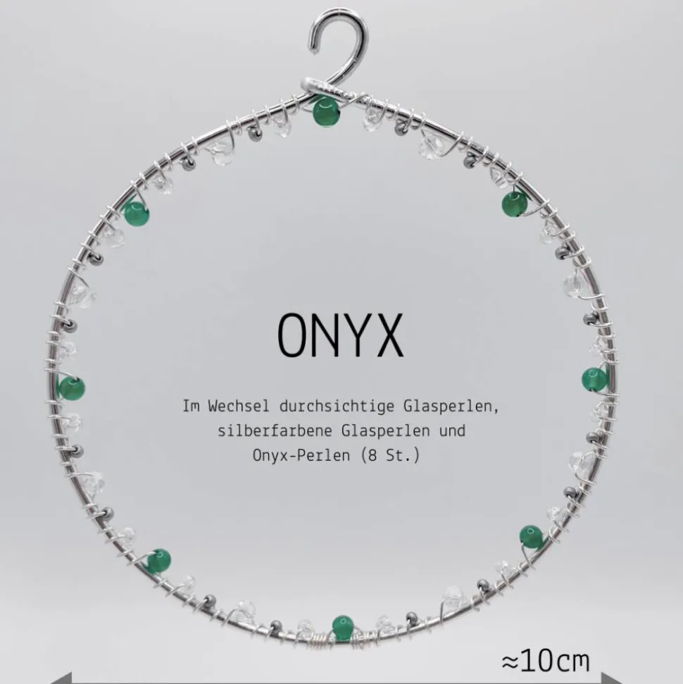 Dieser Fensterschmuck wird liebevoll als Handarbeit gefertigt. Jeder Kreis wird sorgfältig aus rostfreien Aluminiumdraht geformt und mit glänzenden Glasperlen und Energie spendenden Heilsteinen dekoriert. Jeder Fensterschmuck ist ein Unikat mit 8 Heilsteinen und einem Durchmesser von ungefähr 10 cm.