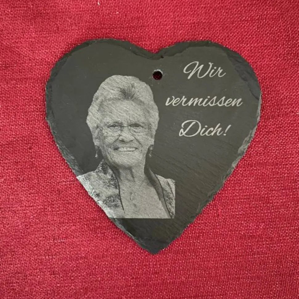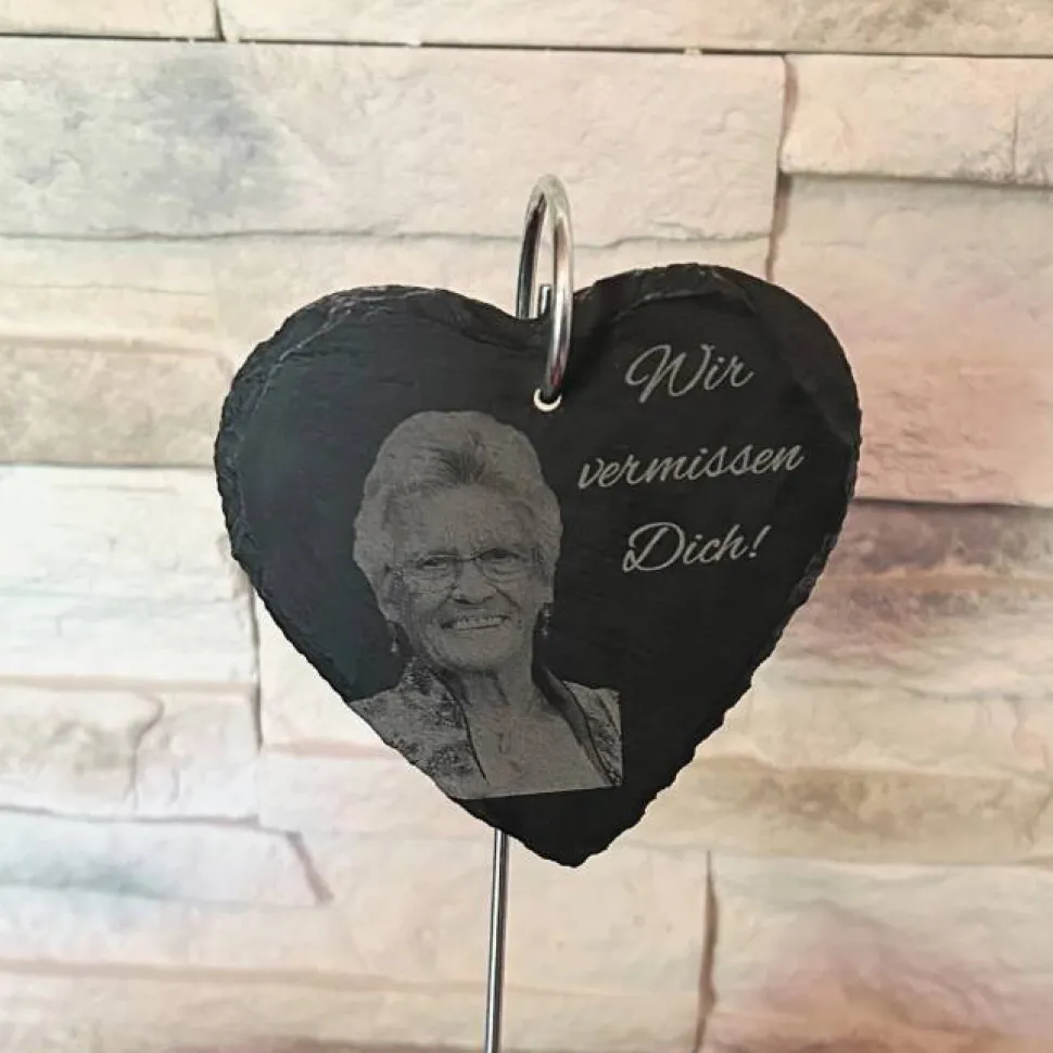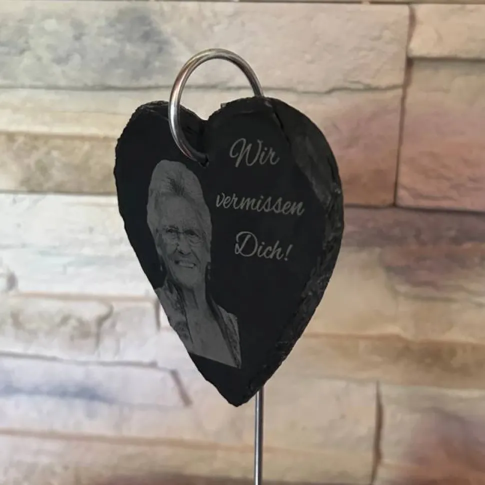 Diese herzförmige Schiefertafel mit individueller Lasergravur ist ein stilvolles Andenken an einen geliebten Menschen. Sie bietet Raum für ein persönliches Foto sowie den gravierten Schriftzug „Wir vermissen Dich!“ – für ein stilles Gedenken, das von Herzen kommt.