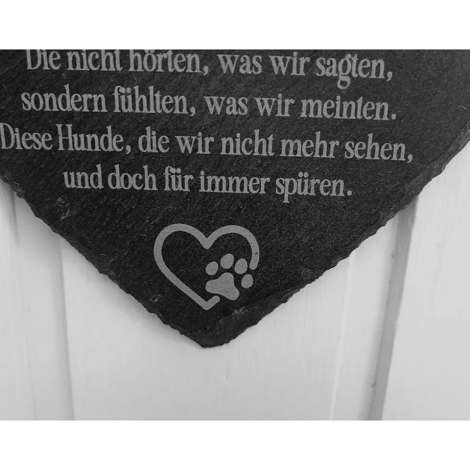Die Platzierung des Textes variiert leicht, da ich die Gravur individuell an die Form und Bruchkanten jedes einzelnen Schieferherzens anpasse.