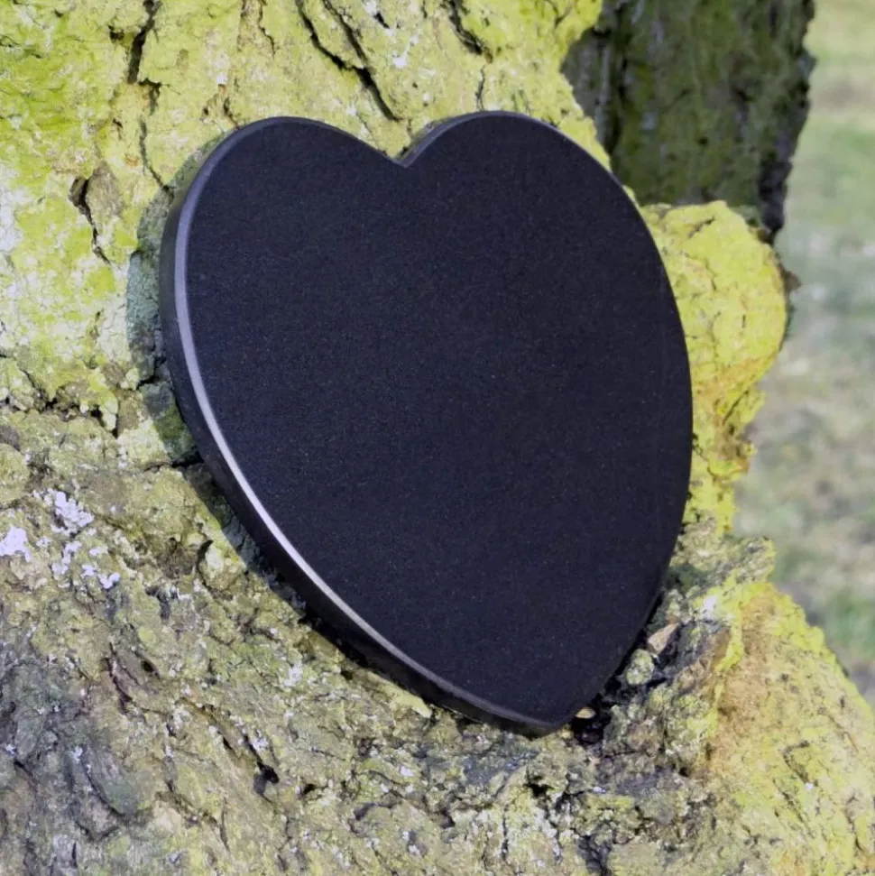 Jedes Herz ist ein Einzelstück und das hier zum Angebot abgebildete Herz zeigt nur ein Modellbeispiel. Die Marmorherzen aus Naturstein für Ihre Wunschgravur sind erhältlich in schwarz, teils dunkel marmoriert und weisen rundherum eine hochglänzende, polierte Oberfläche mit geschliffenen, glatten Kantenfasen auf.