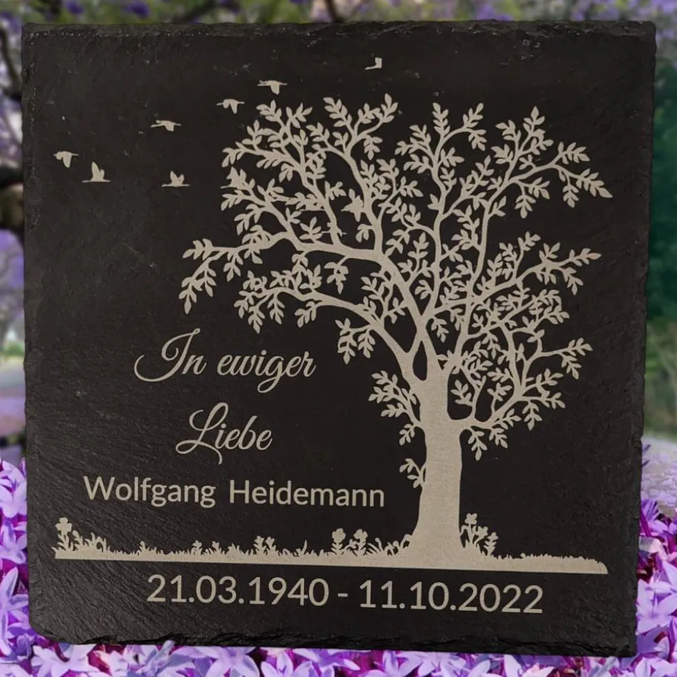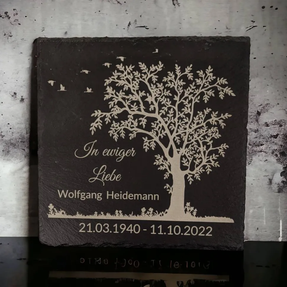 Bild und Schrift werden mittels modernsten Hochleistungs-Lasern fest im Schiefer eingebrannt. Die Grabplatte wird also nicht bedruckt oder beklebt. Die Gravur ist wetterbeständig und nutz sich auch bei dauerhafter Sonneneinstrahlung nicht ab.