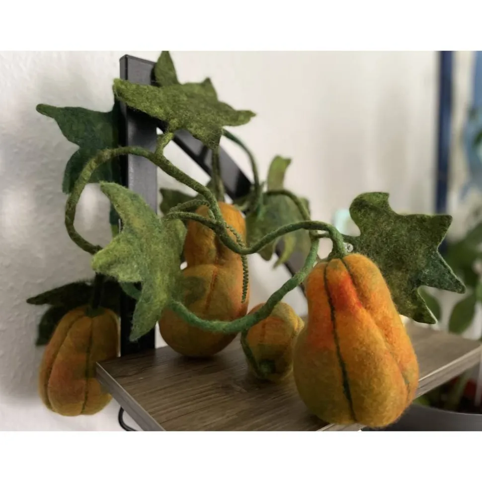 Diese handgefertigte Kürbisranke aus hochwertigem Wollfilz bringt herbstliche Stimmung in jeden Raum. Mit einer Länge von ca. 120 cm eignet sie sich ideal zum Drapieren auf dem Tisch, um Kerzen, an Regalen oder als Fensterdeko. Die liebevoll gefilzten Kürbisse in warmem Orange und die großen grünen Blätter verleihen deinem Zuhause ein natürliches, gemütliches Flair.