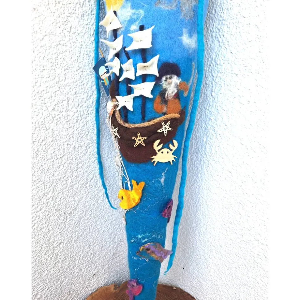 In sehr aufwändiger Detailarbeit habe ich diese Zuckertüte mit einem Piratenschiff gefilzt.