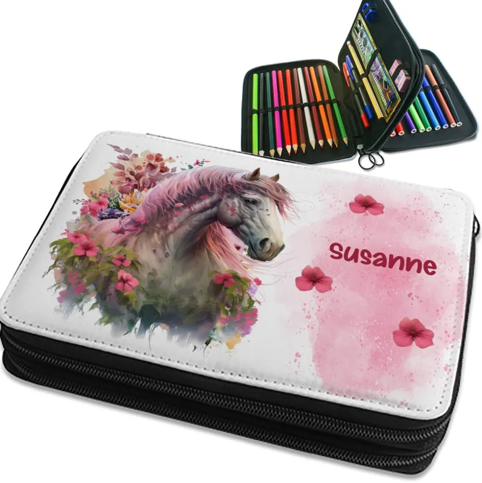 Hier mit einem weißen Pferd, umgeben von Blumen. Rechts ein rosa Hintergrund mit Blüten und Platz für den Namen des Kindes.
