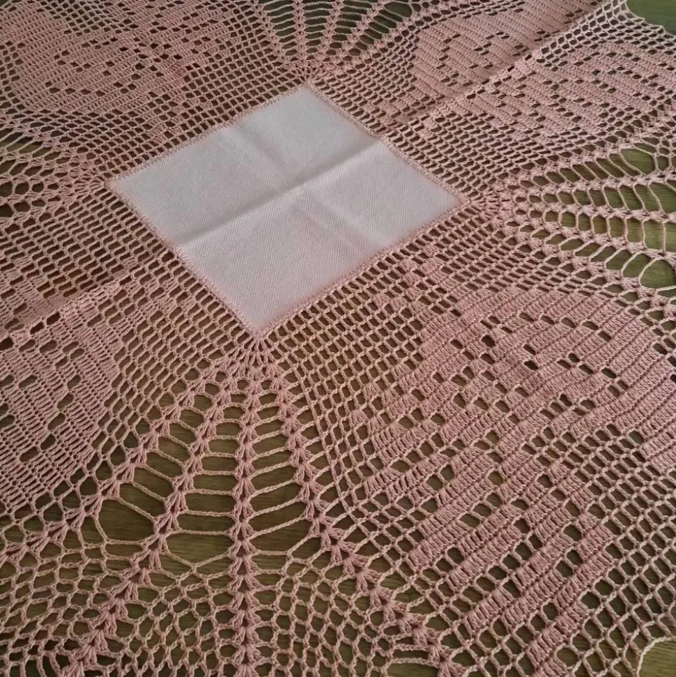 Eine Mitteldecke mit einem Stoffquadrat in der Mitte. Sie wurde mit Filettagarn gehäkelt. Die Farbe ist Altrosa. Die Größe ca. 90×90 cm. Ideal für die Osterdeko.