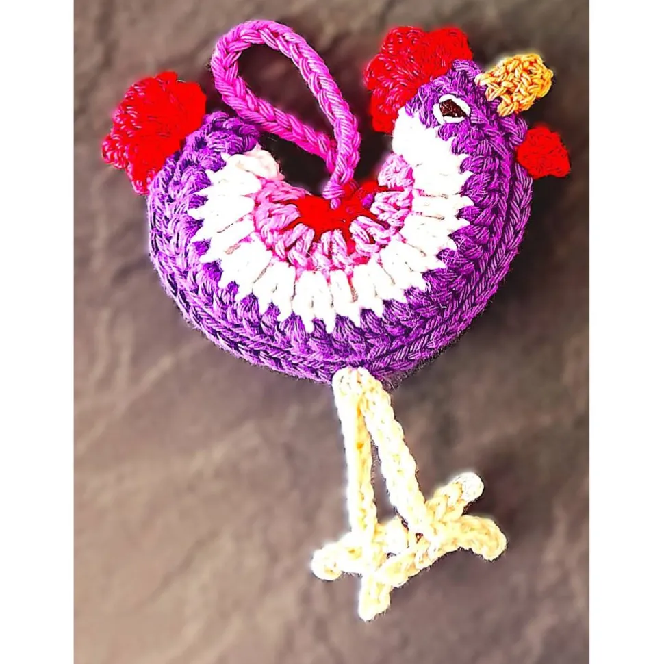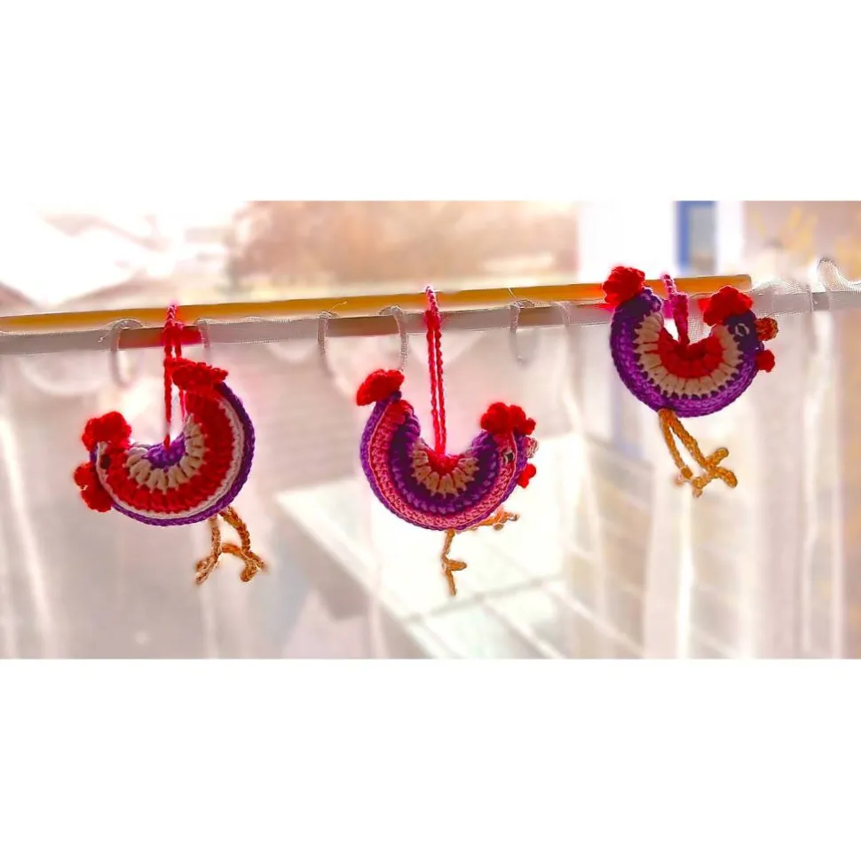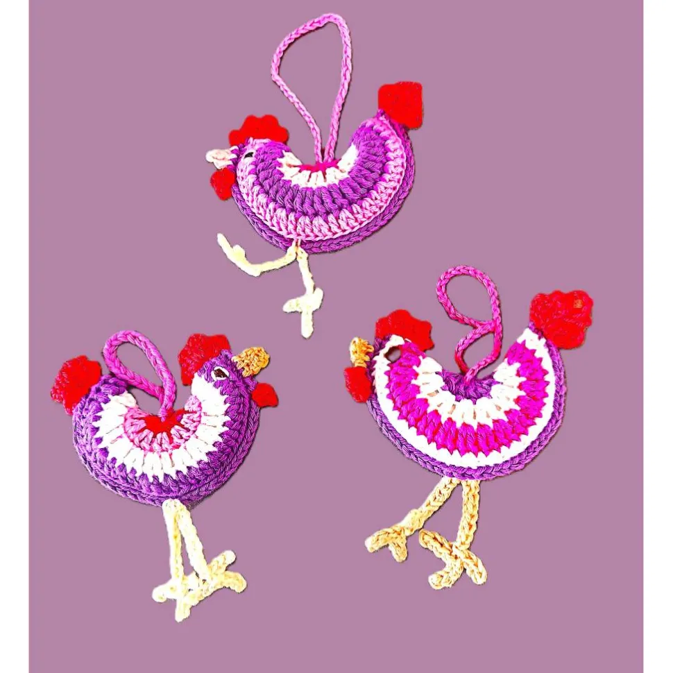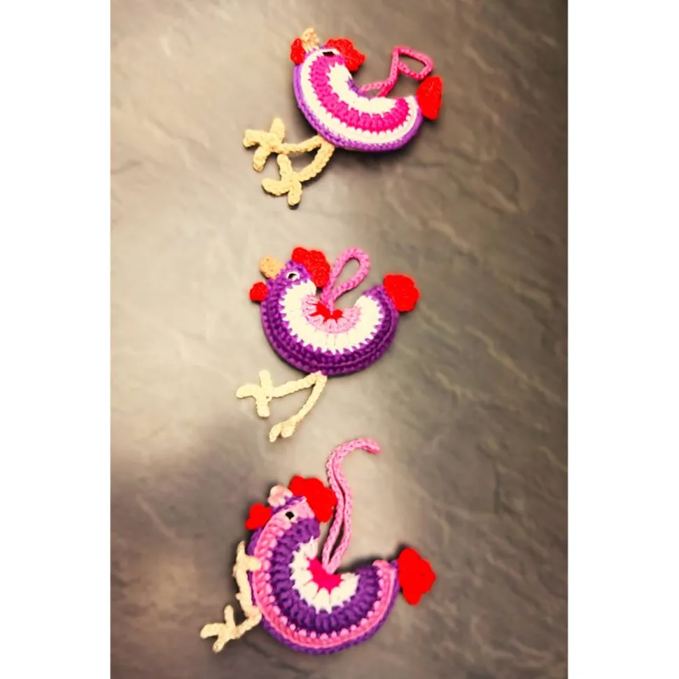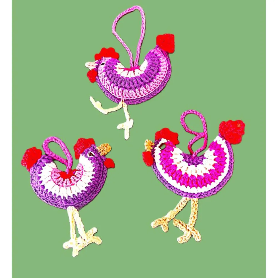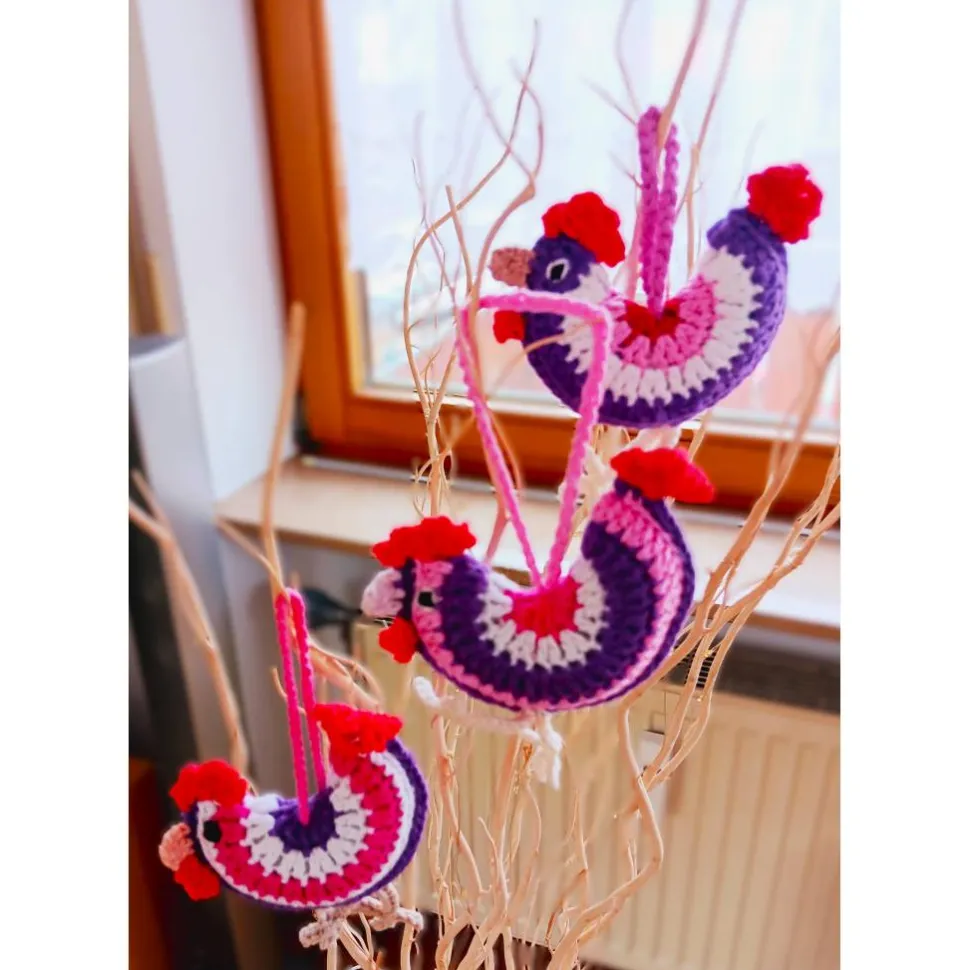Drei Hühner für den Osterstrauß oder die Osterdeko am Fenster. Ein Ast genommen und mit einer Schnur beide Enden verbinden. Die Hühner darauf schieben. Schon ist die tolle Fensterdeko angebracht. Die drei Hühner sind ca 10 cm breit von Schnabel bis Schwanz und 10 hoch von Kamm bis zu den Zehenspitzen. Sie sind aus Baumwollgarn gehäkelt und mit Füllwatte gefüllt. Ich habe hier rosa mit lila und weiß ausgetauscht. Gleiche Farben und doch ganz unterschiedliche Wirkung