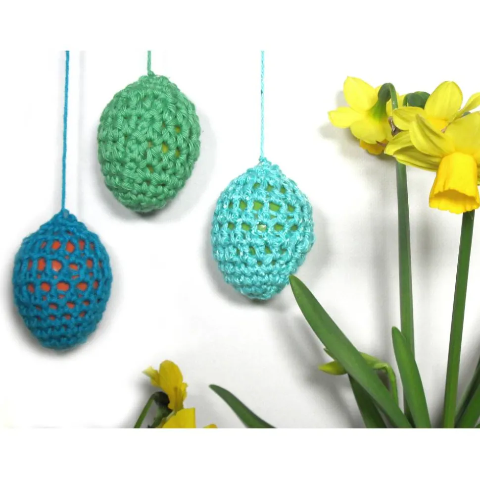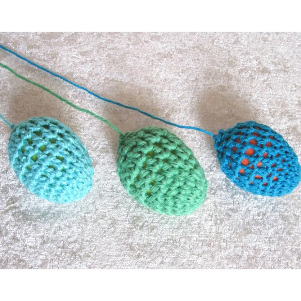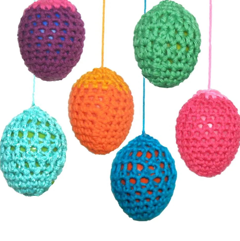 Bringen Sie Farbe und Freude in ihre Osterdekoration mit diesem Set aus sechs gehäkelten Ostereiern zum Aufhängen. Jedes Ei ist liebevoll in festen Maschen gehäkelt und besticht durch seine fröhlichen Farben: türkis, violett mit pink, grün, pink mit rosa, blau und orange mit ocker. Jedes Ei besteht aus einem umhäkelten Kunststoff-Ei und ist 7 cm hoch sowie 5 cm breit.