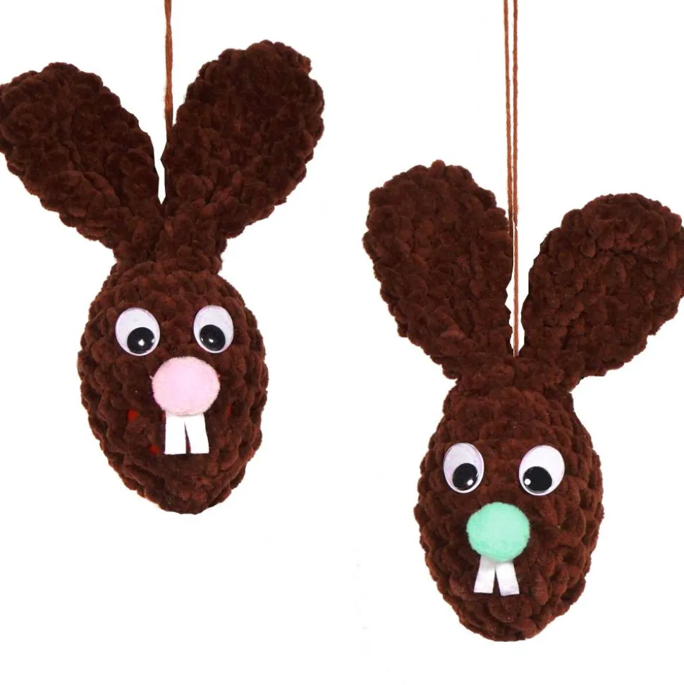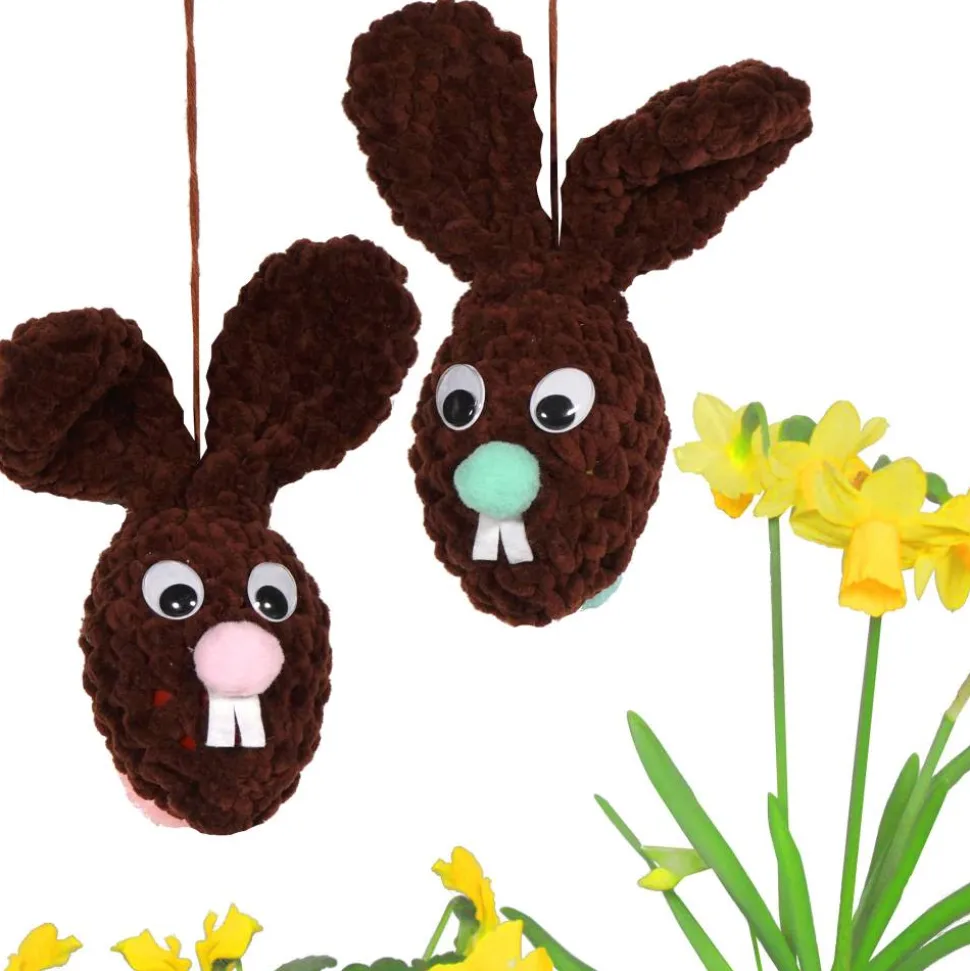 Holen Sie sich die handgefertigten Osterfreude nach Hause! Die beiden dekorativen XL Osterhasen zum Aufhängen sind ein absoluter Blickfang für ihre Osterdeko. Sie werden mit festen Maschen aus brauner Flauschwolle gehäkelt und jedes Exemplar ist ein Unikat. Einer der Hasen trägt eine rosa Nase und Puschel, der andere hat mintgrüne Akzente. Beide sind mit Kunststoff-Wackelaugen versehen, die Zähnchen bestehen aus Filz und die niedlichen Nasen und Puschel sind als Pompoms gearbeitet. Im Inneren verbirgt sich jeweils ein umhäkeltes Kunststoff-Ei.