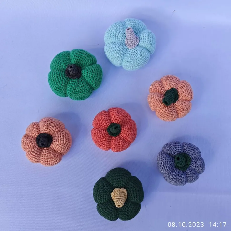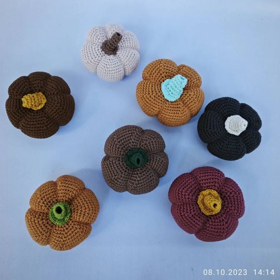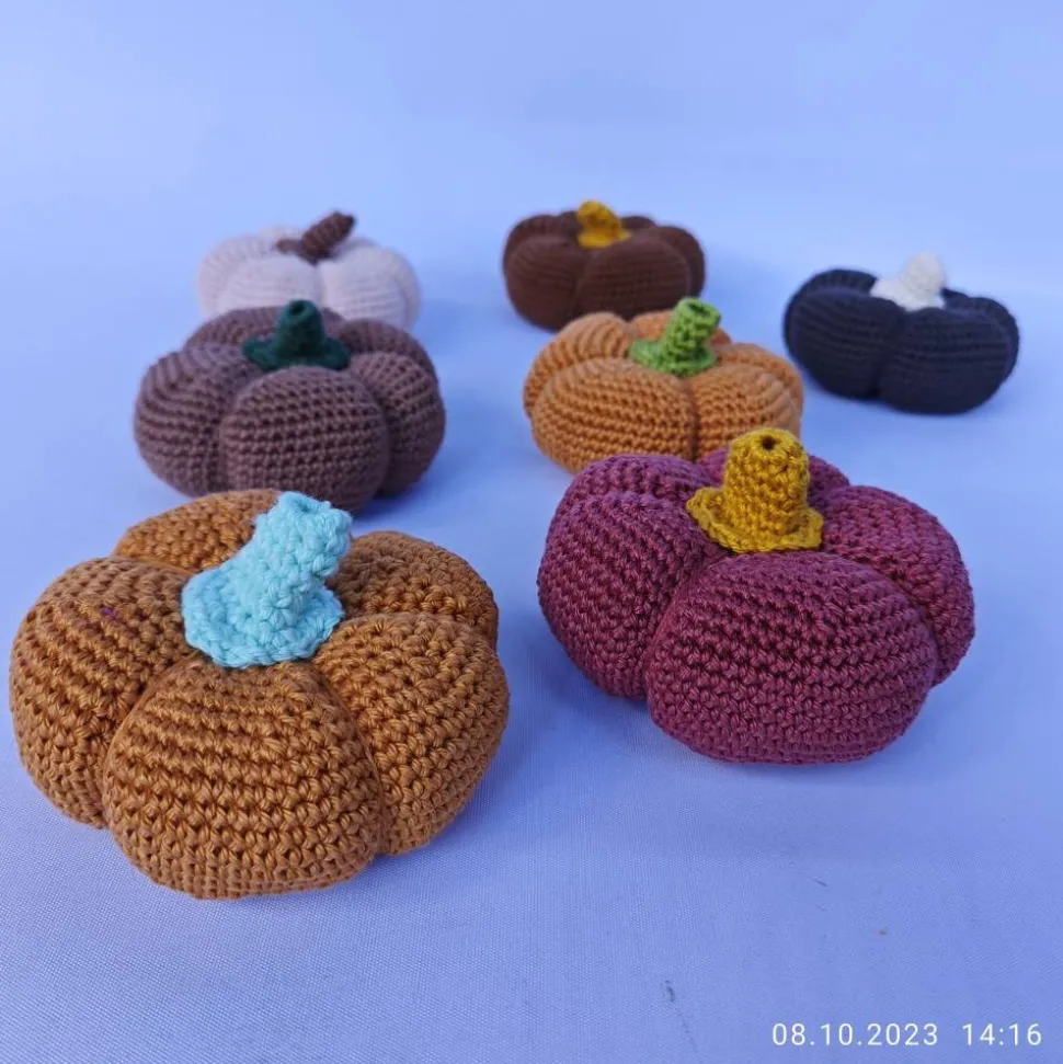 jeder Kürbis wurde sorgfältig von Hand gehäkelt, aus 100 % Baumwolle und mit Bastelwatte in Form gebracht, die Größen variieren etwas, was bei Handarbeit total „normal“ ist