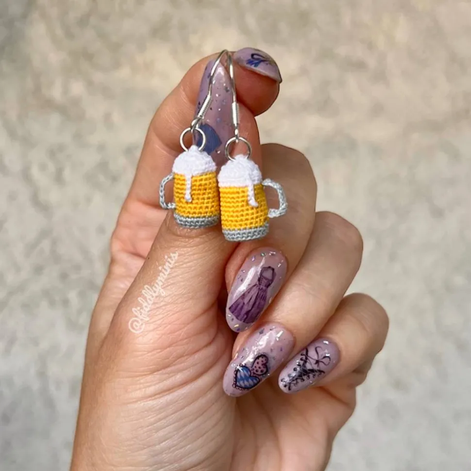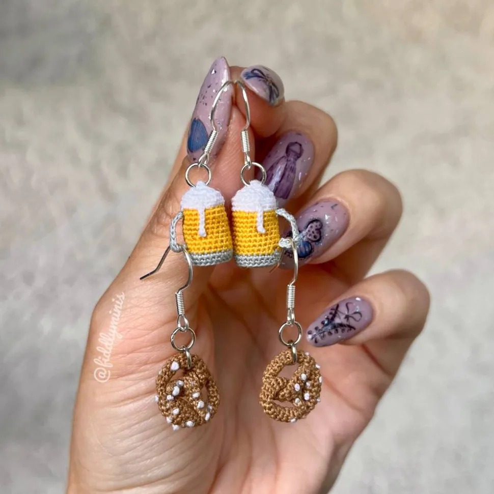 Diese mikrogehäkelten Bierkrug/Brezel-Ohranhänger sind das perfekte Accessoire für besondere Anlässe wie das Oktoberfest. Jedes Stück ist ein Unikat und wurde mit Liebe zum Detail gefertigt. Diese winzigen Kunstwerke sind nicht nur perfekte Geschenke für Bierliebhaber und Oktoberfest-Enthusiasten, sondern auch eine einzigartige Ergänzung für Miniaturwelten und Szenen.